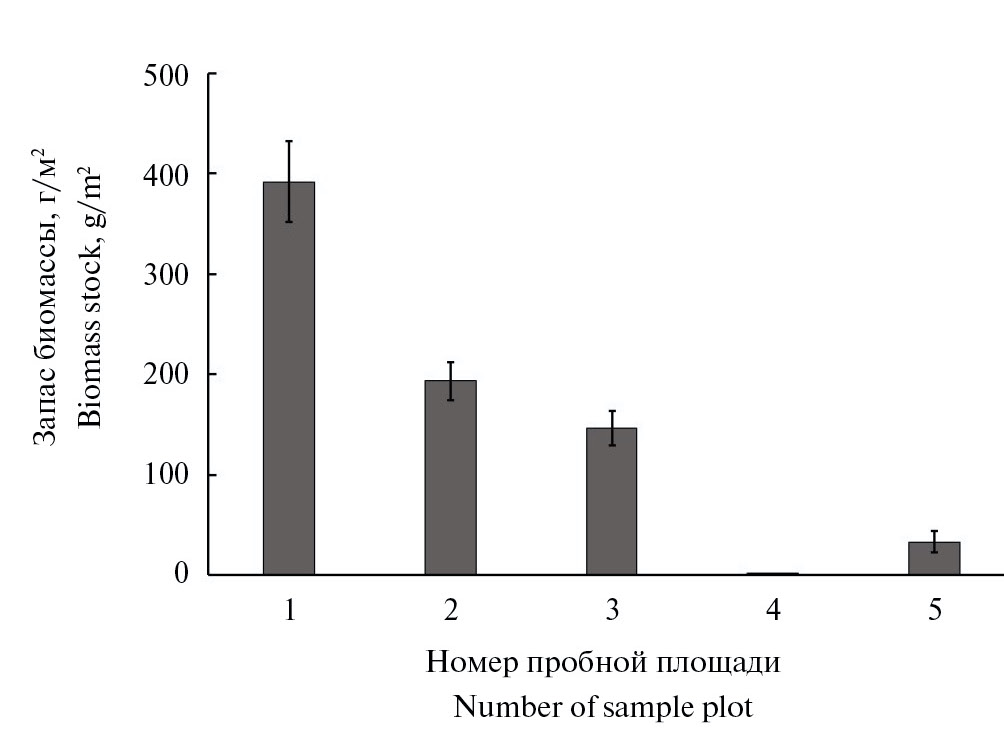 В фоновых сосновых лесах основной вклад в общий запас надземной биомассы вносит мохово-лишайниковый ярус (рис. 7), причем доля лишайников составляет свыше 90%, а доля мхов не превышает 10%. В пределах буферной зоны вклад мохово-лишайникового яруса в общий запас биомассы снижается до 70% и достоверно не различается на ПП4 и ПП5. На территории импактной зоны его доля уменьшается до 5–40%, т. е. здесь напочвенный покров сформирован практически только травяно-кустарничковым ярусом.