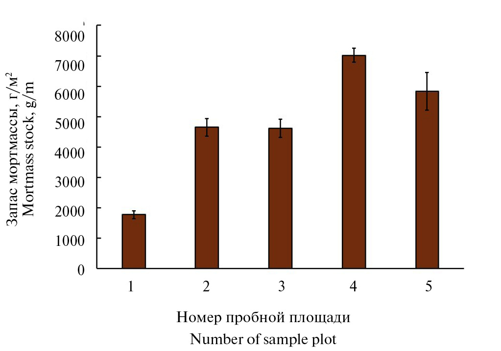Fig. 6. Stock of forest litter in the studied pine forests.
