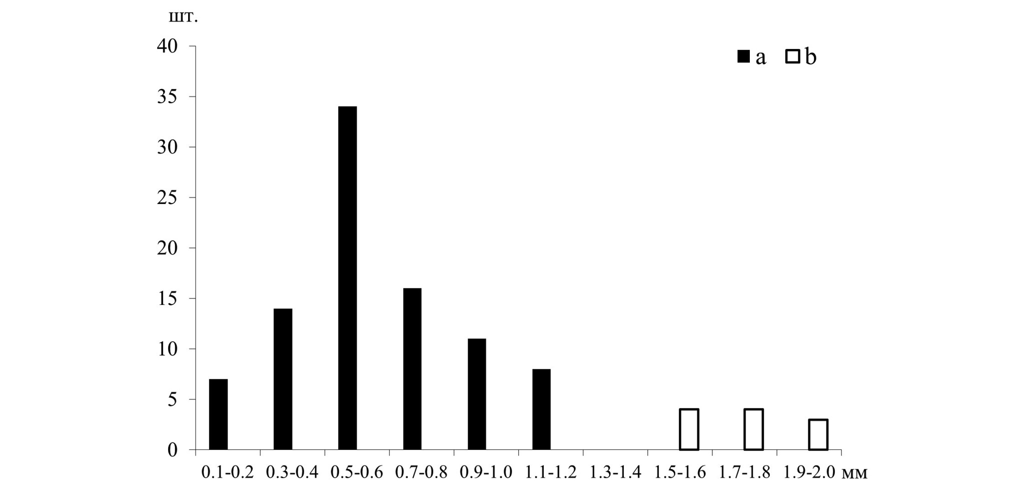 Для определения степени развития андроцея у особей T. pannonicus исследовали варьирование длины тычинок у обоеполых цветков и стаминодиев у пестичных цветков . Изучение проводили в период массового цветения растений в ценопопуляции ЦП1. Обоеполые цветки протандричные. Андроцей обоеполого цветка представлен двумя парами тычинок: коротких верхних и длинных нижних, пыльники содержат визуально хорошо различимую пыльцу. Андроцей пестичного цветка представлен стаминодиями, которые имеют короткие стерильные пыльники без пыльцы или пыльники отсутствуют полностью. Выбраны два морфометрических параметра андроцея: длина нижней тычинки или стаминодия (тычиночная нить вместе с пыльником) и длина пыльника или стерильного пыльника. Выбор этих параметров обусловлен тем, что нижние тычинки цветков более длинные и удобнее для учета. Измерение параметров проводили с помощью бинокуляра МБС-1 при увеличении 8 × 2. Выборка составляла 101 особь: 11 гермафродитных (все обнаруженные особи этой половой формы в выборке) и 90 женских особей. У каждой особи исследовали по 5–10 цветков (всего около 700 цветков). Просматривались полностью раскрытые цветки, расположенные в средней части соцветия на оси главного порядка у нескольких генеративных побегов каждой особи. Данные по цветкам одной особи усреднялись. Для анализа вариабельности длины тычинок и стаминодиев мы разделили исследуемую выборку особей по этому показателю на 10 групп с шагом 0.2 мм (рис. 1). Степень варьирования размеров тычинок и стаминодиев у разных типов цветков определяли с использованием коэффициента вариации C v , % (отношение стандартного отклонения к среднему значению признака). Статистическую з начимость различий морфометрических параметров оценивали по t-критерию Стьюдента ( р < 0.05) ( Zaitsev , 1991).
