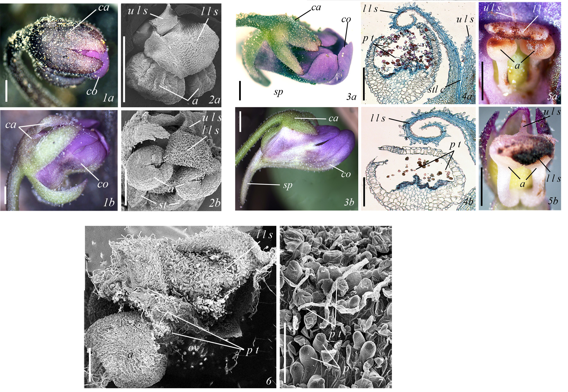 1а, b – dense flower bud, appearance, 2а, b – reproductive organs in dense flower bud: (SEM), 3а, b – opening flower bud, appearance, 4а, b – structure of the anther and the lower lip of the stigma in opening flower bud on the longitudinal section (germinating pollen is visible in anthers), 5а, b – development of receptivity of the stigma surface to pollen in opening flower bud (reaction with 1% KMnO4), 6, 7 – numerous pollen tubes growing into the surface of the lower lip of the stigma (SEM, 7 – magnified); a – anther, са – calyx, со – corolla, l l s – lower lip of the stigma, р – papillae, р t – pollen tube, sp – spur, st – stamen filament, stl c – style canal, u l s – upper lip of the stigma.