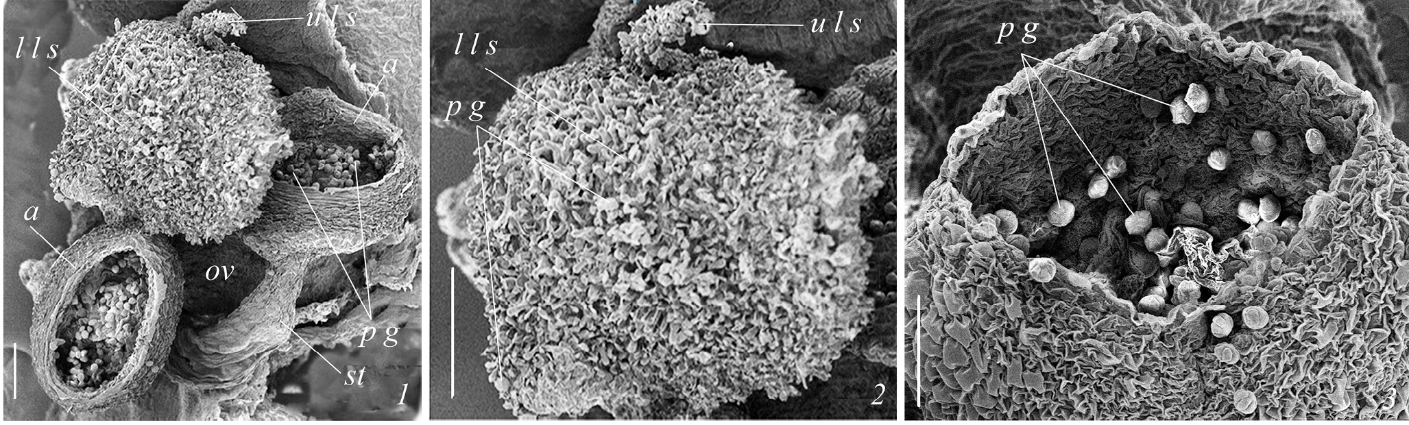 1 – аppearance of the anthers and the lower lip of the stigma, 2 – surface of the lower lip with pollen grains (magnified), 3 – opened apical part of the anther of the same flower, missing germination of pollen grains in the anther is observed (SEM); a – anther, l l s – lower lip of the stigma, ov – ovary, р g – pollen grains, st – stamen filament, u l s – upper lip of the stigma.