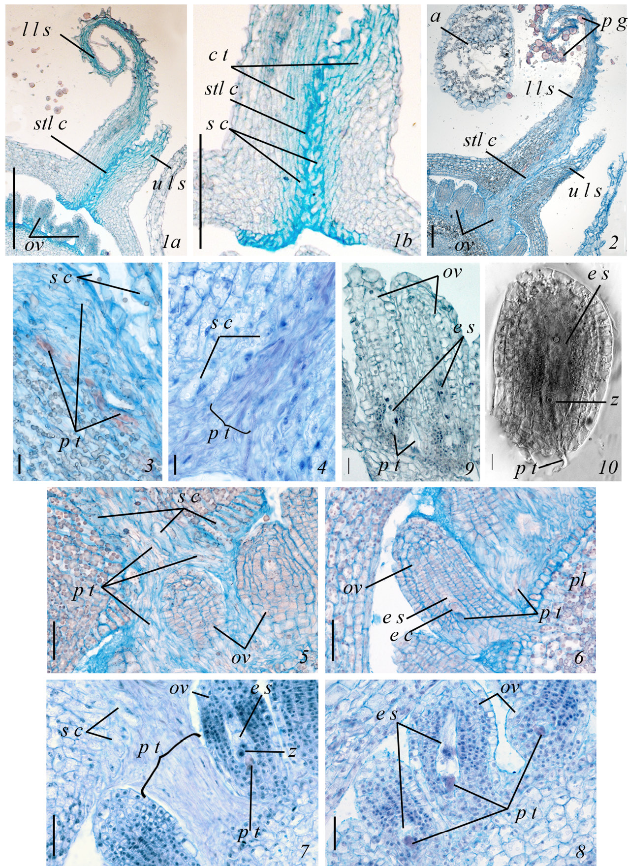 1a, b – the structure of the stigma and style before the penetration of pollen tubes (1а – general view, 1b – a fragment of a style with a conductive tissue, magnified), 2 – stigma and style after penetration of pollen tubes, 3, 4 – conductive tissue with pollen tubes in the middle (3) and lower (4) parts of the style, 5, 6 – a powerful "column" of pollen tubes at the outlet of the style canal and along the surface of the ovules, 7–10 – penetration of the pollen tube tips into the embryo sac of almost every ovule; 1–9 – longitudinal sections, coloring with hematoxylin after Ehrlich and alcyan blue, 10 – total preparation of ovule, DIC; a – anther, с t – conductive tissue, e с – egg cell, e s – embryo sac, l l s – lower lip of the stigma, o v – ovule, р g – pollen grains, р t – pollen tube, s с – stigmatoid cells, stl c – style canal, u l s – upper lip of the stigma, z – zygote.