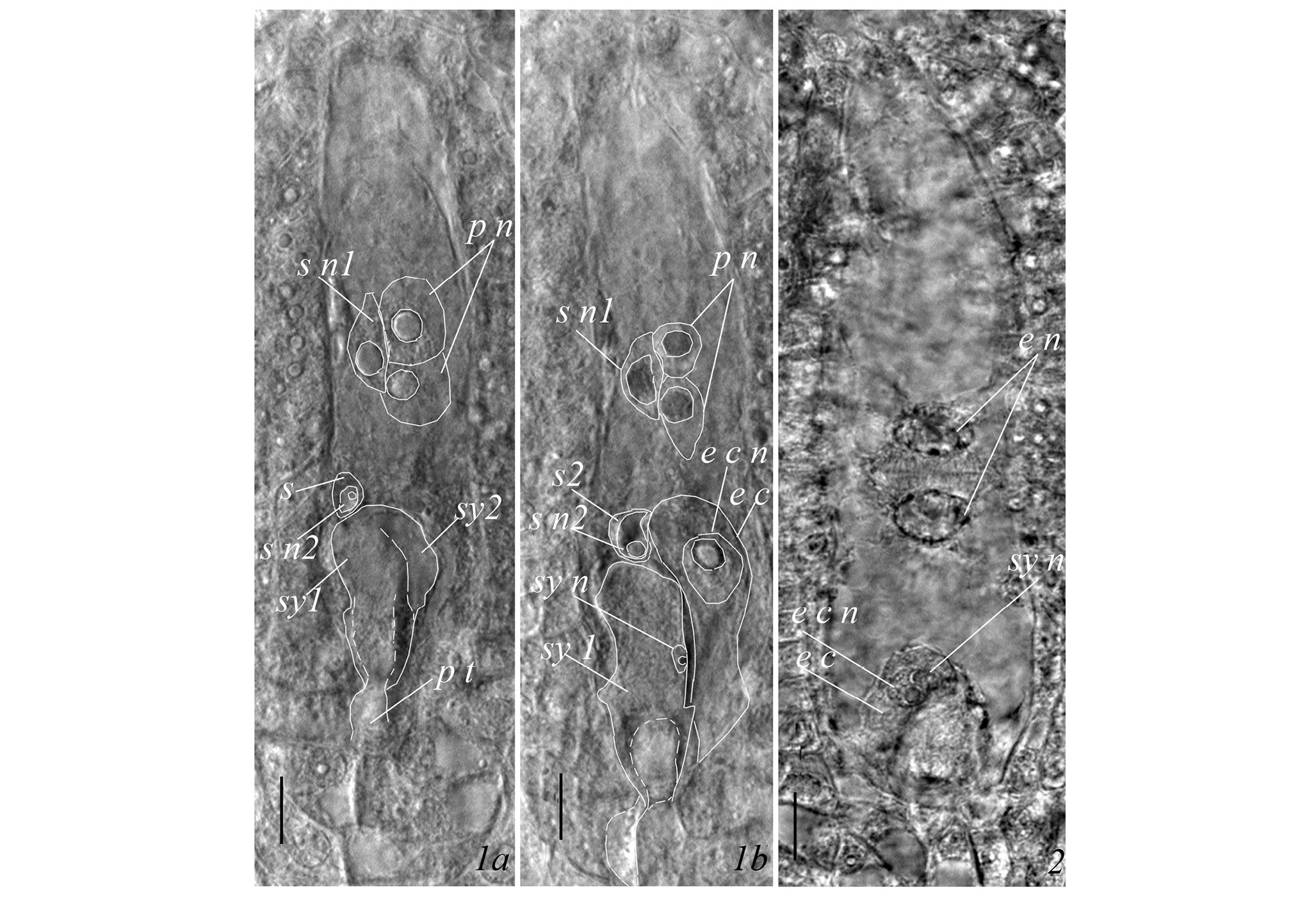 1а, b – один из спермиев возле яйцеклетки, второй – уже объединен с центральной клеткой, с его ядром, находящимся в контакте с полярными ядрами, синергида с проникающей пыльцевой трубкой гипертрофирована (последовательная фокусировка); 2 – деление первичной клетки эндосперма (телофаза) при объединении ядер спермия и яйцеклетки; ec – яйцеклетка, e c n – ядро яйцеклетки, e n – делящееся ядро первичной клетки эндосперма, s, s2 – спермии, s n1, s n2 – ядра спермиев, sy1, sy2 – синергиды, sy n – ядро синергиды, p n – полярные ядра, p t – пыльцевая трубка.