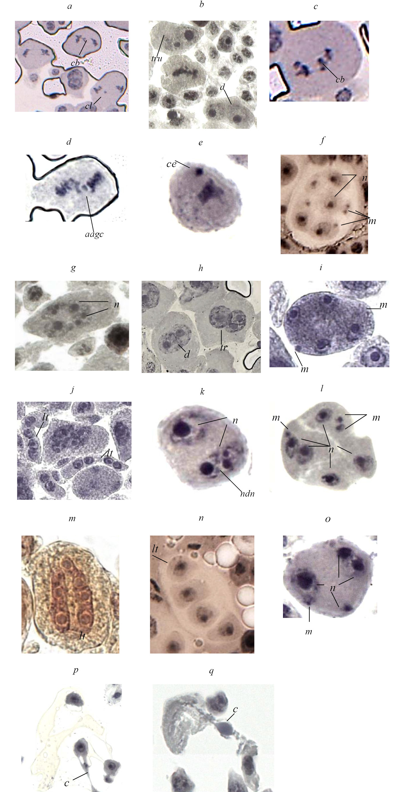 Fig. 1. Meiotic disorders during microsporogenesis in Ribes and Grossularia species: a – AI; b – stage of microspore tetrad formation; c – AI; d – MII; e – МI; f–o – stage of microspore tetrad formation (f – hexad; g – heptad, unequal size of nuclei; h – triad and dyad; i – micronuclei emissions; j – linear tetrads; k – non-disjunction of nuclei (three nuclei together); l – pentad; m – two linear tetrads under a common callose membrane; n – linear tetrad; o – unequal size of nuclei, micronucleus in the cavity of the nucleus); p – cytomixis, transition of a bivalent from one cell to another in PI; q – cytomixis, transition of a whole nucleus from one cell to another in PI; cb – chromosome bridges; cl – chromosome lag; tru – triad, unequal size of nuclei; d – dyad; tr – triad; aagc – asymmetric arrangement of groups of chromosomes; ce – chromosome ejection; m – micronucleus; n – nucleus; lt – linear tetrads; ndn – non-disjunction of nuclei; cc– cytomictic channel.