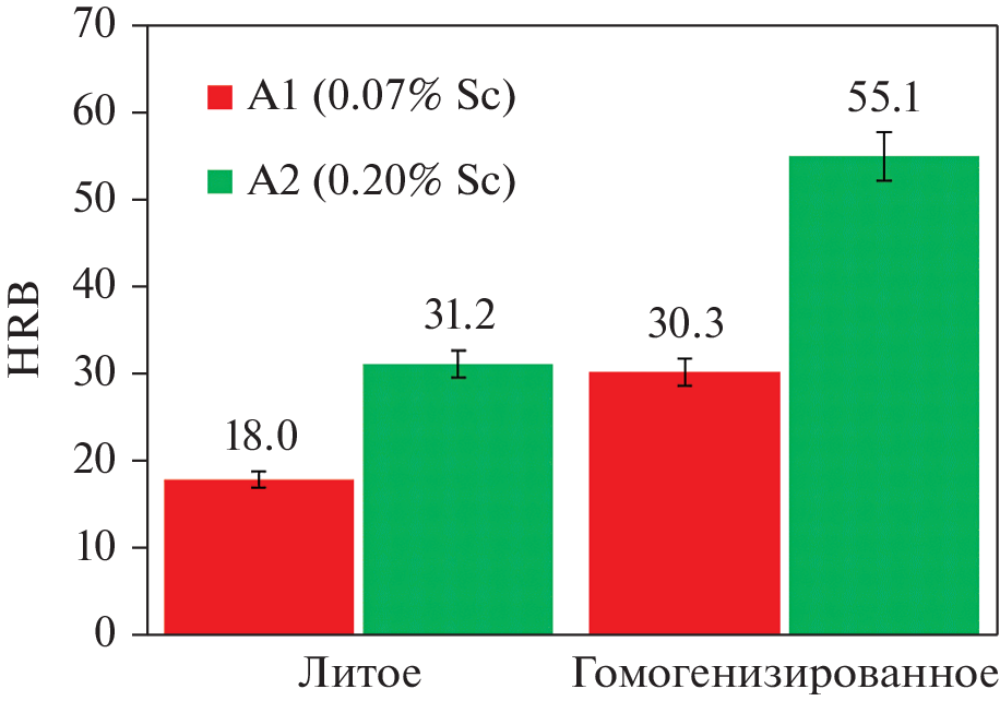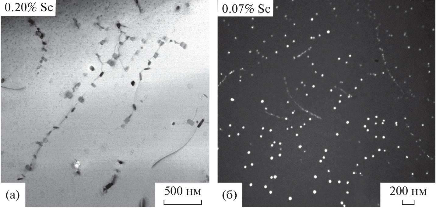 Round ingots 110 mm in diameter and cold-rolled sheets 2 mm in thickness, which were made of experimental Al–Mg–Sc alloys containing different scandium content (0.07, 0.20 wt %), have been studied. Transmission electron microscopy and thermodynamic simulation have been used to investigate the peculiar-ities of the structural-phase state of the material. A reduction in scandium content from 0.20 to 0.07% has been found to result in a twofold increase in the grain size in ingots, a 46% drop in hardening of ingots after homogenization, and a 10–20% decrease in the strength of annealed sheets, which has been caused by a smaller amount of the key phase, Al3(Sc, Zr). A good level of strength characteristics of experimental annealed sheets made of alloy with low scandium content 0.07 wt % (σu > 400 MPa, σ0.2 > 300 MPa) has been achieved and it is higher than that of the traditional AMg6 alloy (σu > 350 MPa, σ0.2 > 150 MPa).