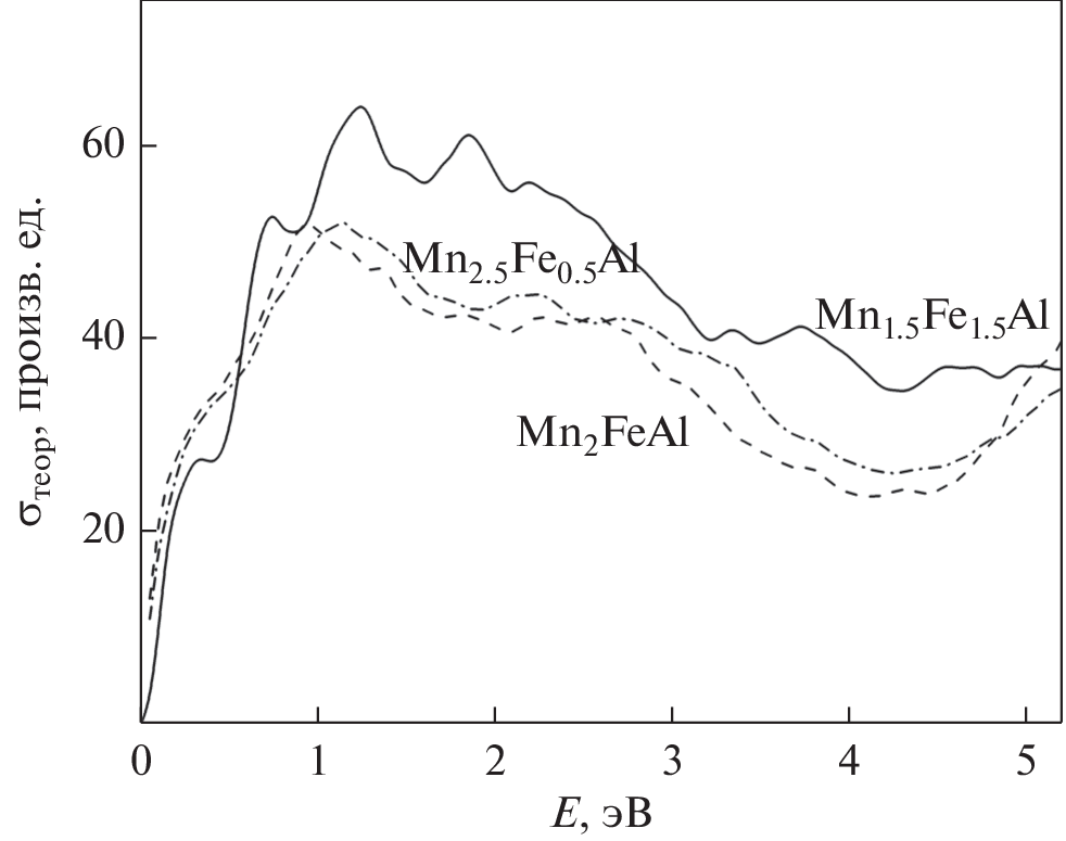 Представлены результаты расчетов электронной структуры, оптического спектра и экспериментального исследования оптических свойств сплавов Гейслера Mn2 – xFe1 + xAl (x = –0.5, 0, 0.5, 1). Обнаружено аномальное для металлических систем поведение оптической проводимости сплавов в ИК области спектра – отсутствие Друдевского роста и высокий уровень межзонного поглощения. Показано, что такое поведение определяется особенностями электронной структуры: уровень Ферми расположен в области высокой плотности состояний, формируемой d-состояниями Mn и Fe.