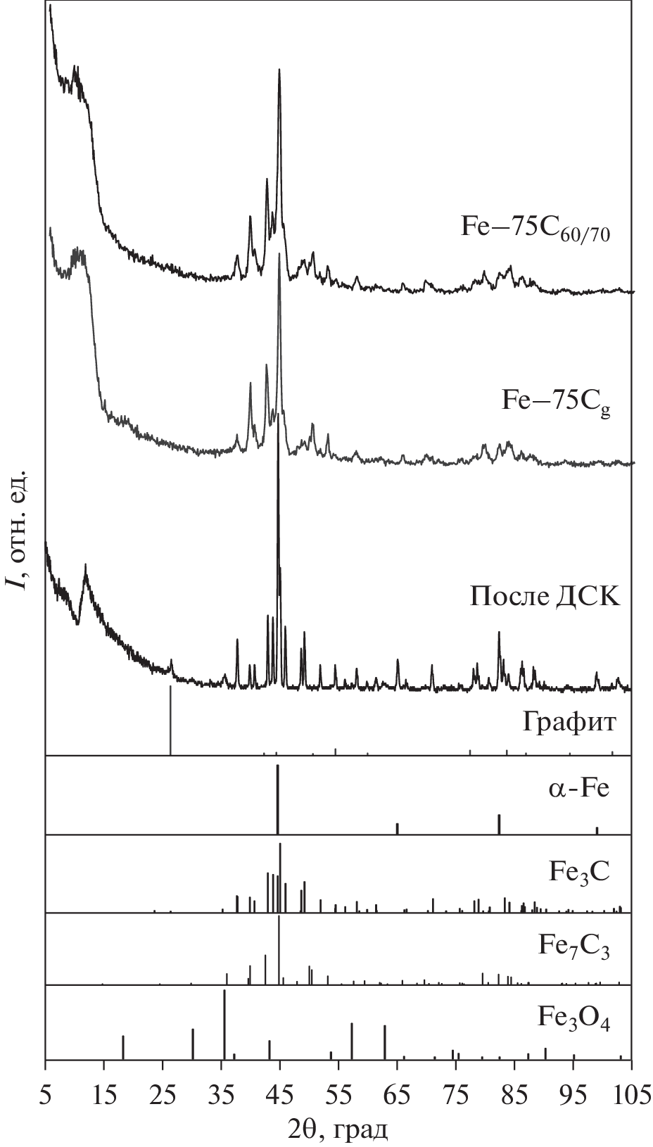 - Dong X.L., Zhang Z.D., Xiao Q.F., Zhao X.G., Chuang Y.C., Jin S.R., Sun W.M., Li Z.J., Zheng Z.X., Yang H. Characterization of ultrafine γ-Fe(C), α-Fe (C) and Fe3C particles synthesized by arc-discharge in methane // J. Mater. Sci. 1998. V. 33. P. 1915–1919.