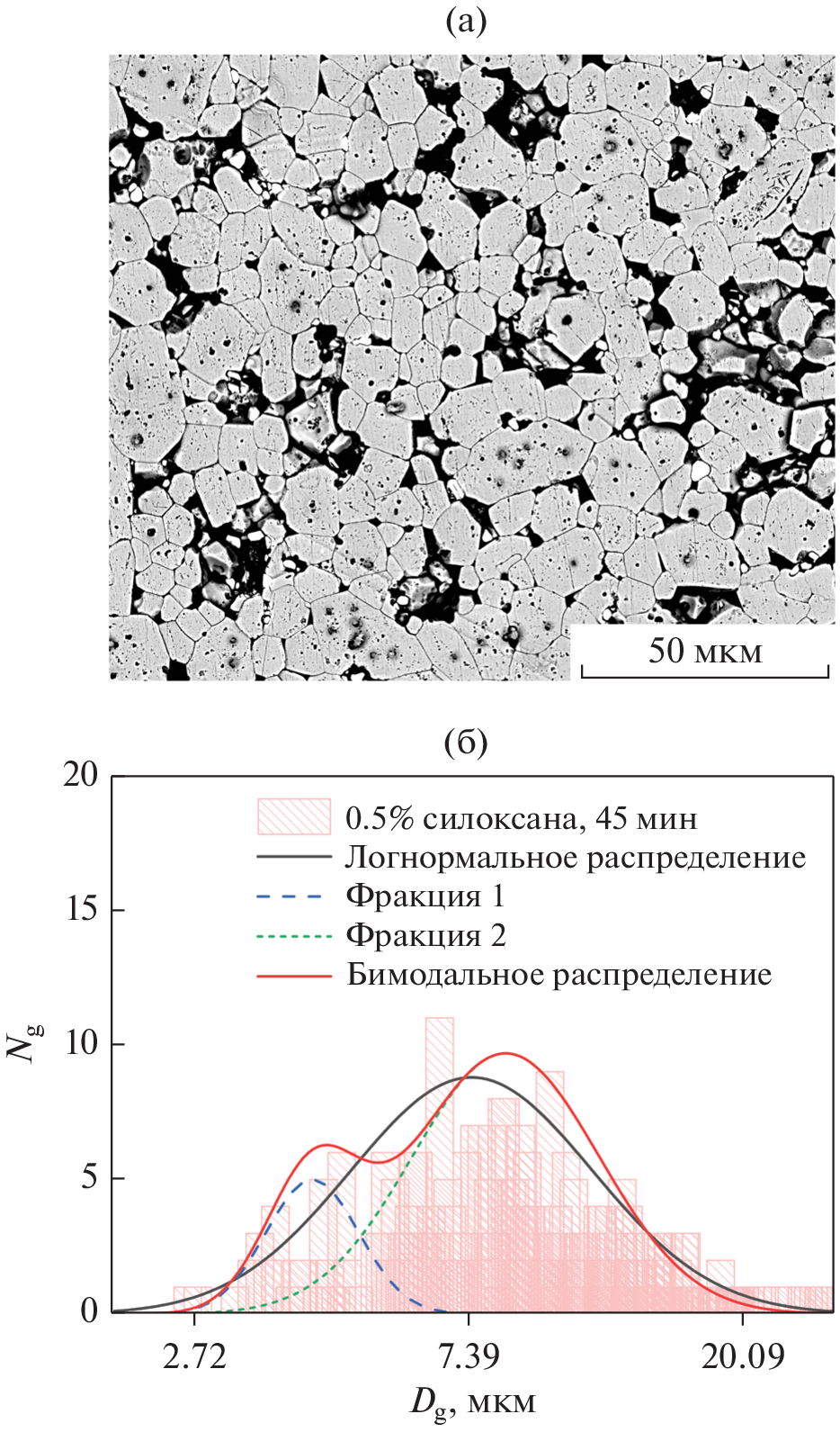 The granulometric composition of Nd–Fe–B powders has been studied in detail after vibratory milling for various times both without and with the addition of siloxane. Sintered magnets were produced by the powder metallurgy method that excluded the pressing of powders. Correlations between the particle size distribution in the initial powders, microstructure of sintered magnets, and their magnetic hysteresis properties have been established. The difference in methods for estimating the size of powder particles by two methods is demonstrated. It is shown that the size distributions of powder particles and magnet grains are bimodal and are described by a superposition of two lognormal distributions.