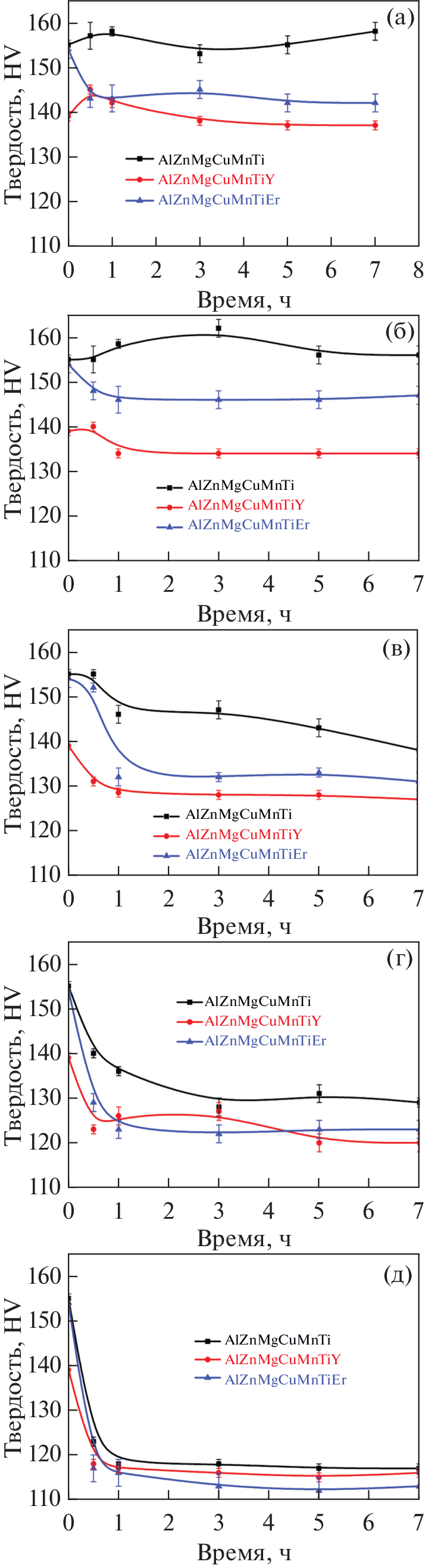 The structure and properties of rolled Zn-Mg-Cu-Zr-Y(Er) alloys alloyed with manganese and modified with titanium have been studied. According to the results of tensile tests in the deformed and annealed state at 120-150°C for one hour, AlZnMgCuMnTi and AlZnMgCuMnTiEr alloys have a high yield strength of 417-456 MPa with a small relative elongation of 2-5.2%. The presence of additional dispersant-forming elements of yttrium and erbium increases the particle precipitation density during homogenization annealing, increasing the temperature of the onset of recrystallization and the hardness of the rolled alloys. After one hour annealing at 350°С, the structure of the AlZnMgCuMnTi alloy is completely recrystallized, while recrystallization is just beginning in alloys with yttrium and erbium. After quenching from 465°C and aging at 120°C, the test alloys have a yield strength of more than 410 MPa, a tensile strength of more than 520 MPa, and an elongation of more than 10%. The obtained properties are higher than the properties of clad sheets of high-strength heat-strengthened alloy Al-Zn-Mg-Cu (B95A) and bars of AlZn4.5Mg1.5Mn and AlZnMg1.5Mn alloys and are at the level of properties of bars of Al-Zn-Mg-Cu alloy (B95).