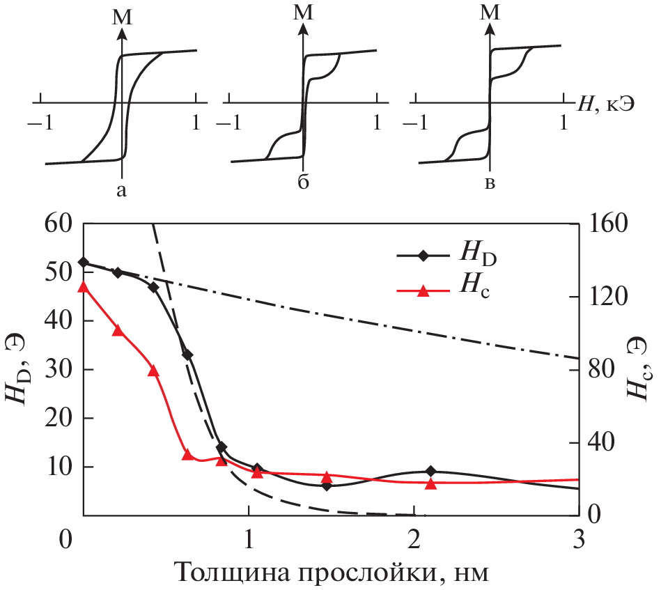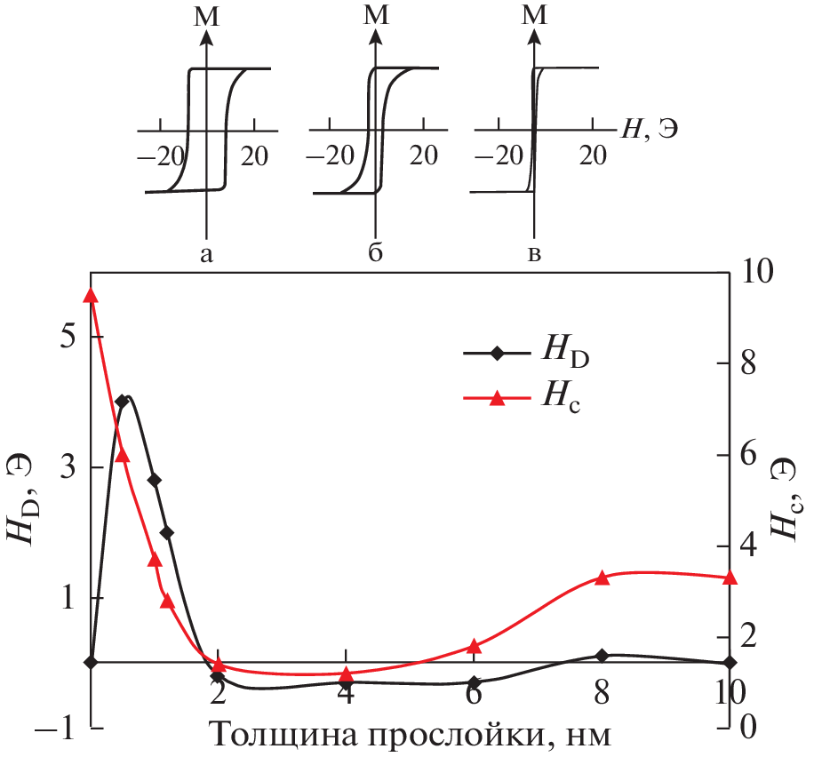 —The results of experimental and theoretical studies of the coercivity and the displacement field of the hysteresis loop on the thickness of the nonmagnetic interlayer in magnetic films obtained by electroless plating are presented. With the help of model calculations based on the Landau–Ginzburg equations, the exchange interactions between magnetic layers with the participation of atoms of the nonmagnetic layer are studied. The resulting expression for the displacement field describes well the exponential changes in the displacement field as a function of the interlayer thickness in structures with both magnetically soft layers and layers with significantly different values of the coercivity.