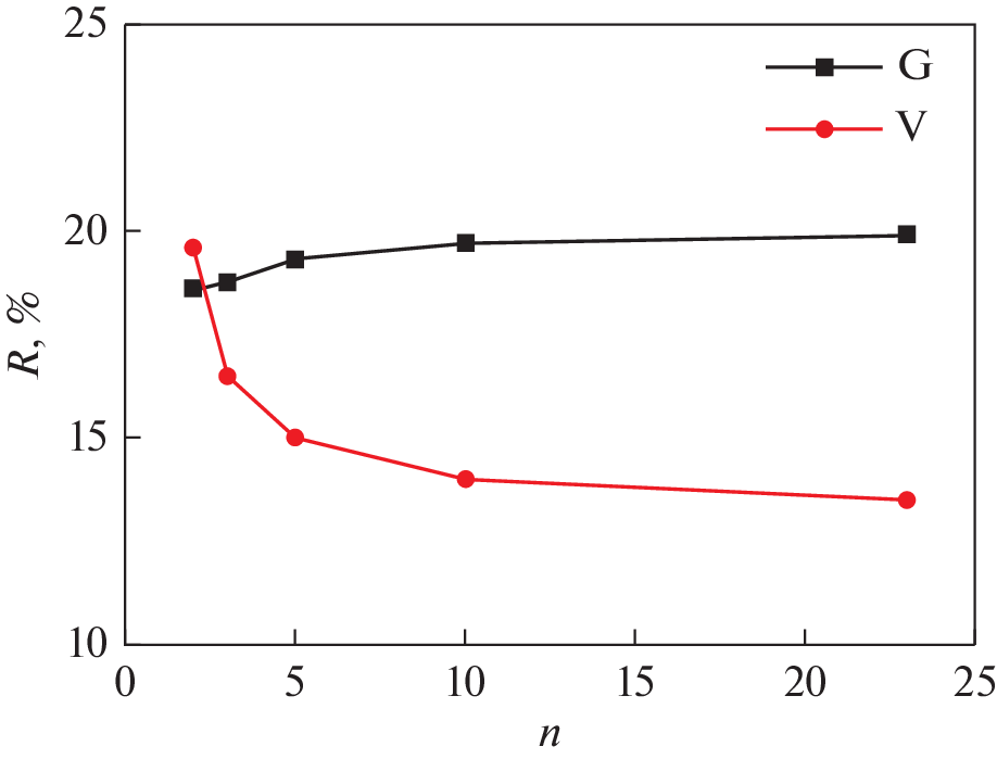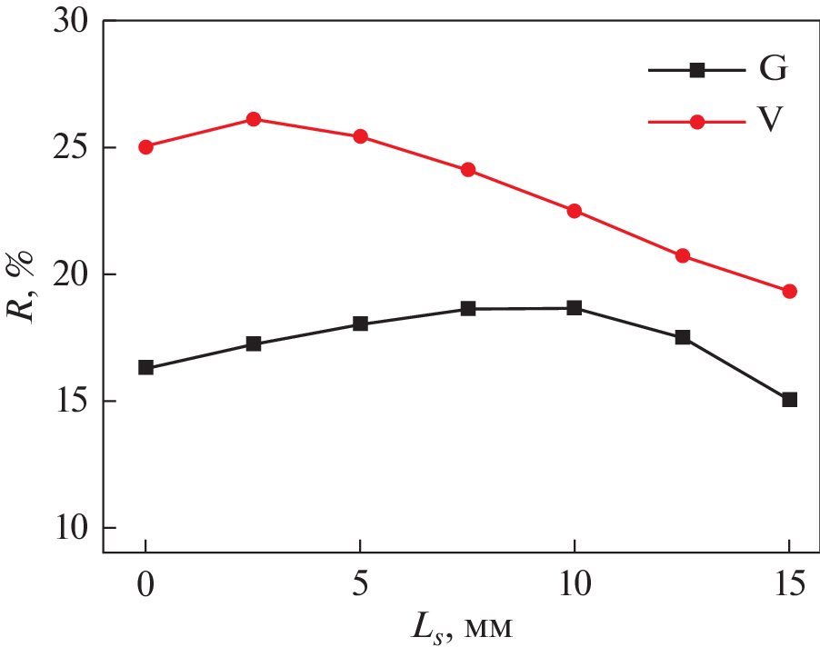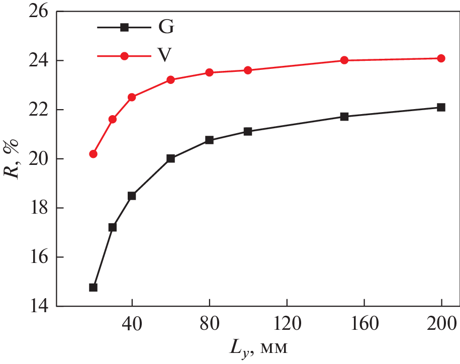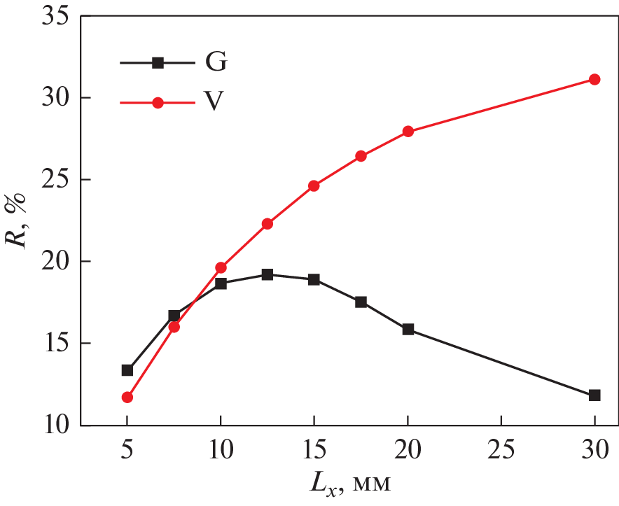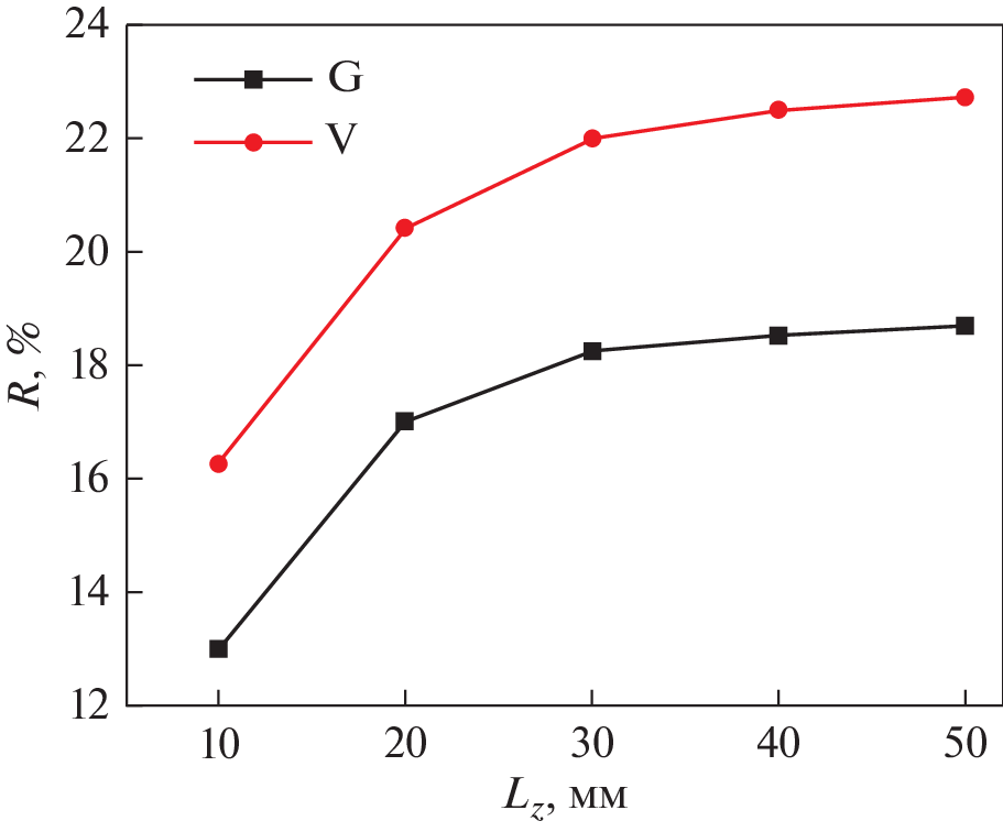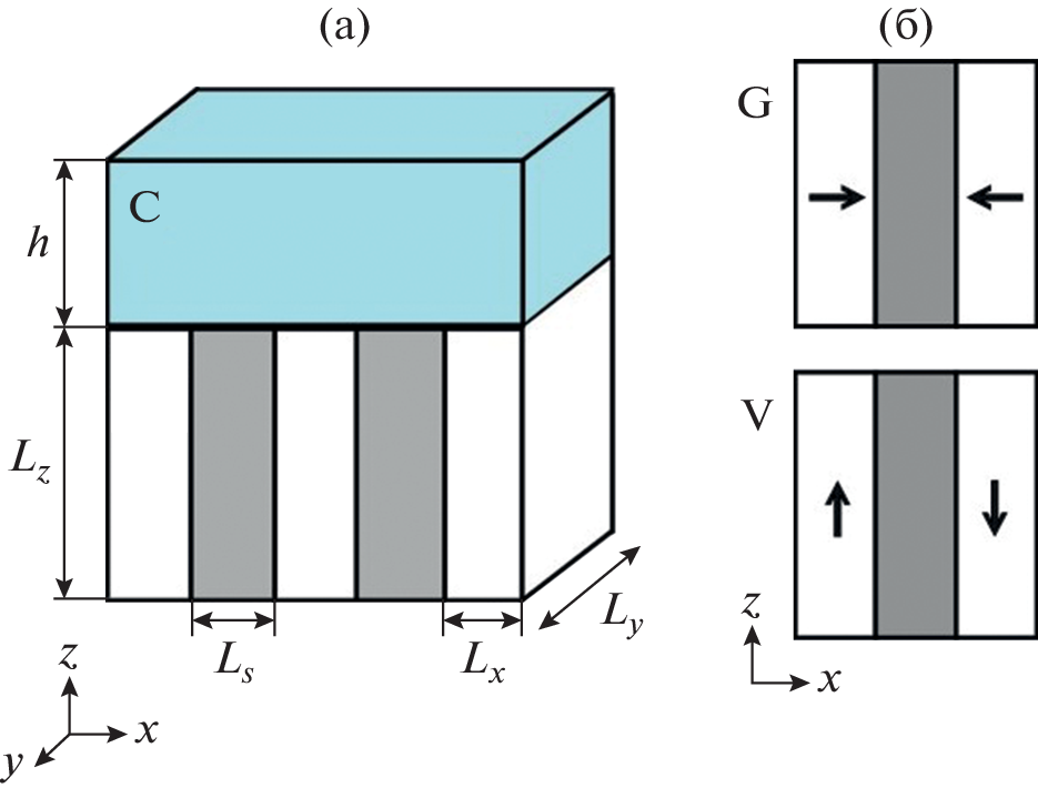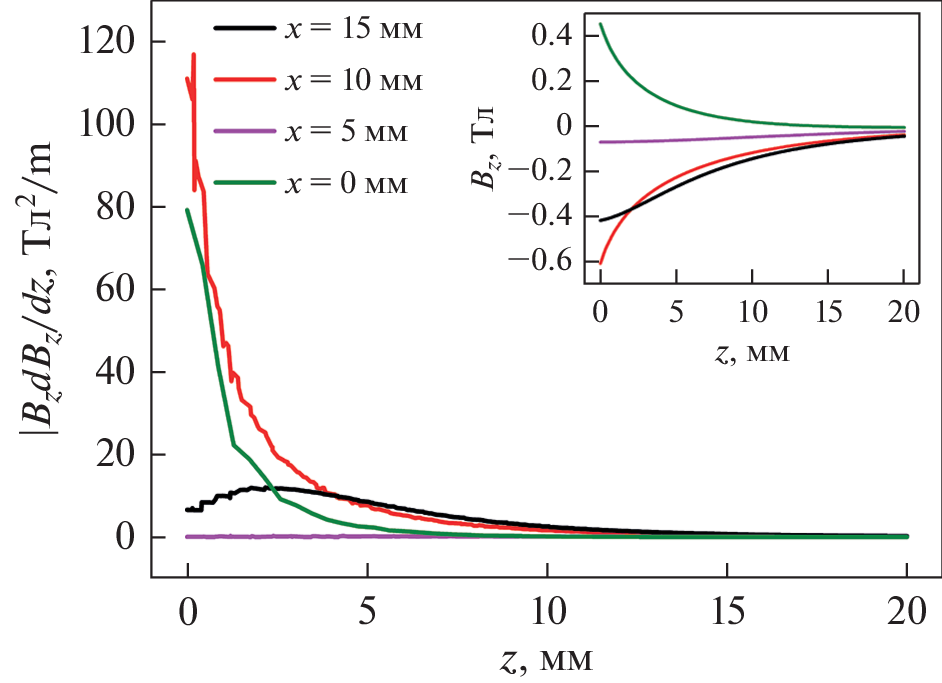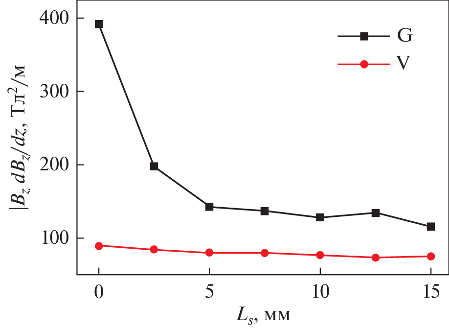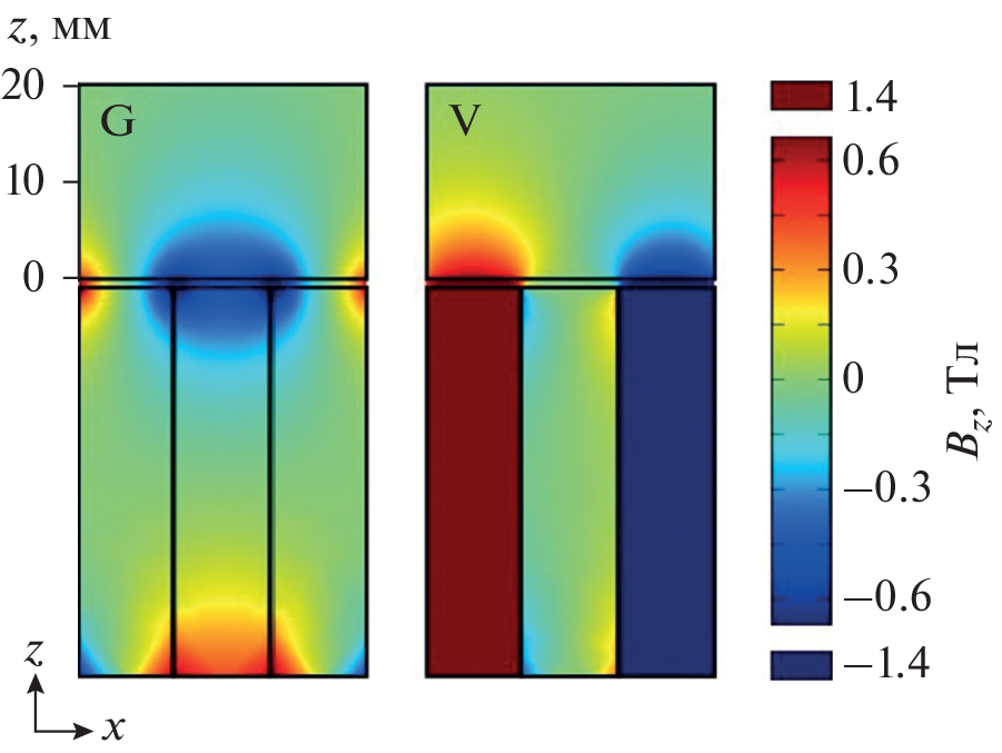 Магнитная седиментация с применением устройств на основе постоянных магнитов является перспективным энергоэффективным и безопасным методом удаления наноразмерных частиц из воды. Проведено численное моделирование распределения магнитного поля в магнитных устройствах, состоящих из комбинации чередующихся плоских постоянных магнитов и вставок из магнитомягкой стали. Рассмотрены два типа устройств с разным направлением намагниченности постоянных магнитов: вертикального (V) и горизонтального (G). Предложен критерий оценки эффективности магнитного устройства R, зависящий от эффективного объема области воды, где реализуется величина произведения \({\text{|}}{{B}_{z}}d{{B}_{z}}{\text{/}}dz{\text{|}}\) > 4 Tл2/м, где Bz – вертикальная компонента магнитной индукции. Варьировали размеры постоянных магнитов и магнитомягких вставок вдоль горизонтальной оси x, соотношение толщин магнитных и стальных пластин и число пластин. Показано, что магнитное устройство типа V позволяет создать эффективный объем, в котором реализуется максимально возможный параметр эффективности R = 31% при толщине магнитных элементов Lx = 30 мм и толщине стальных элементов Ls = 2.5 мм. Магнитное устройство типа G с такими же магнитами, намагниченными горизонтально, позволяет реализовать эффективный объем R = 19% при значениях Lx = = 12.5 мм и Ls = 10 мм. Оба магнитных устройства приемлемо эффективны при выбранных размерах магнитной системы для высоты слоя воды не более 20 мм.