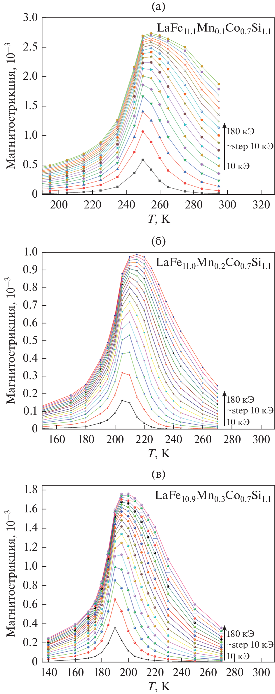 The magnetization and magnetostriction of polycrystalline alloys LaFe11.2 – хMnxCo0.7Si1.1 (x = = 0.1, 0.2, 0.3) were measured in pulsed magnetic fields up to 180 kOe in the temperature range 80–270 K. The replacement of Fe atoms by Mn atoms shifts the TC towards low temperatures and does not affect the value of saturation magnetization. The observed field dependence of the magnetization M(H) near the TC is characteristic of second-order phase transitions, while the temperature dependence of the magnetization M(T) above the TC in strong magnetic fields indicates a first-order magnetic phase transition. The magnetic volume effect ΔV/V reaches 0.81% in a field of 180 kOe. The asymmetry of magnetostriction relative to the temperature of the maximum effect, manifested in strong magnetic fields, and the magnetic field hysteresis of magnetostriction bear signs of a first-order phase transition