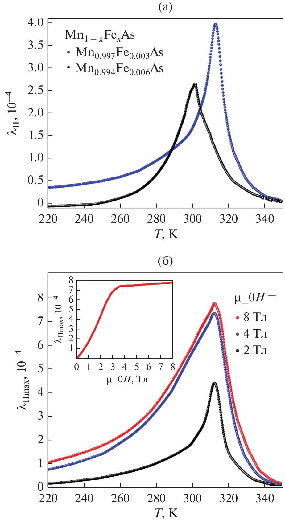The results of studying the temperature dependence of the magnetocaloric effect (ΔТad), thermal expansion and magnetostriction in the Mn1 – хFexAs (х = 0.003, 0.006) system in magnetic fields up to 8 T are presented. It is shown that an increase in the iron concentration in the Mn1 – xFexAs system leads to a shift in the phase transition temperature towards low temperatures by 15 K. In a field of 8 T, the value ΔTad = 8.3 K for the Mn0.997Fe0.003As sample at the initial temperature T0 = 318 K, and ΔTad = 7.7 K for Mn0.994Fe0.006As at T0 = 307 K. The data on thermal expansion and magnetostriction show that the magnetostriction decreases with increasing iron concentration, which also leads to a decrease in the magnetocaloric effect.