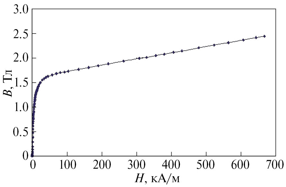 Для определения магнитных характеристик использовали методику измерений, требования к образцам и измерительной аппаратуре в соответствии с ГОСТ 8.377–80 и ГОСТ 12119.2–98. Измерения проводили с использованием аппаратно-программного комплекса, разработанного в “НИИЭФА им. Д.В. Ефремова” [11].
