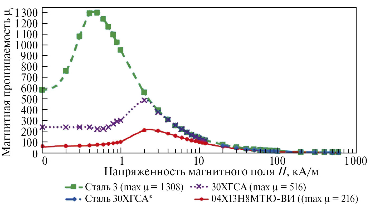 На рисунке 9 можно видеть, что максимальное значение µᵣ стали 30ХГСА в 2.5 раза ниже, чем у стали 3, а у стали 04Х13Н8МТЮ–ВИ, соответственно, в 6 раз ниже относительно стали 3 и, примерно, в 2.4 раза ниже, чем 30ХГСА.