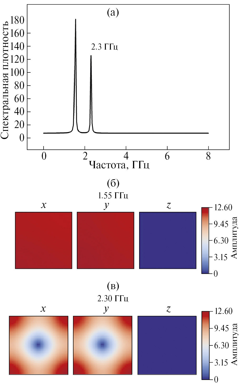 Вместе с тем возбуждение намагниченности, соответствующее высокочастотным модам, является неоднородным. Например, на рис. 3б отмечена мода с частотой 2.1 ГГц. Распределение амплитуды колебания показывает, что это так называемая угловая мода. Когда напряженность внешнего поля приближается к нулевому значению, вихревое распределение намагниченности охватывает оба слоя образца, за исключением небольшого участка в центре, образованного намагниченностью, направленной нормально по отношению к плоскости пленки. При такой напряженности внешнего поля остаются только неоднородные моды ФМР (рис. 3г) – моды более низких порядков. В отсутствие внешнего поля распределение возбуждения намагниченности для моды 0.15 ГГц максимально на границах пленки и отсутствует в ее центре (аналогично второй моде на рис. 2). Кроме того, появляется мода 0.5 ГГц, чье распределение амплитуды возбужденной намагниченности имеет вид, представленный на рис. 4б – оно напоминает распределение амплитуды для низкочастотной моды за исключением того, что в центре теперь обнаруживается два минимума сигнала намагниченности.