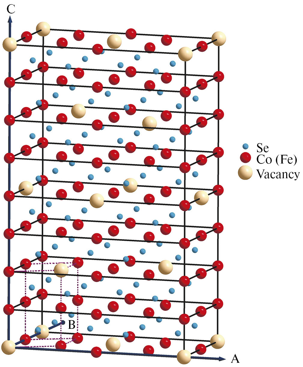 Халькогенид Fe₄Co₃Se₈ относится к классу катион-дефицитных слоистых соединений M₇X₈, где M –атомы переходных металлов, X – двухвалентные анионы VI группы таблицы Менделеева S, Se, Te. Для этих соединений характерно наличие вакансий в металлических слоях, а также образование разных сверхструктур в результате упорядочения вакансий и M атомов в слоях. Вакансии в соединениях M₇X₈ со структурой типа NiAs распределяются в каждом втором базисном слое атомов переходных металлов, что является основным принципом формирования этих сверхструктур (рис. 1). Хорошо известным представителем этого класса соединений является железосодержащий минерал – пирротин Fe₇S₈ [1, 2].