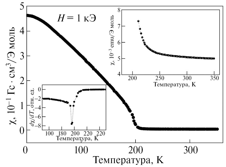 Температурная зависимость магнитной восприимчивости χ(T) Fe₄Co₃Se₈ представлена на рис. 3. Резкий рост вблизи T = 200 K свидетельствует о переходе соединения в магнитоупорядоченное состояние ниже этой температуры. Температурная зависимость производной dχ/dT (нижняя вставка) позволяет более точно определить температуру Кюри TC = 196 K. Это значение оказалось чуть ниже значения TC = 205 K, полученного для соединения Fe₄Ti₃Se₈, в котором атомы титана не обладают магнитным моментом [13].
