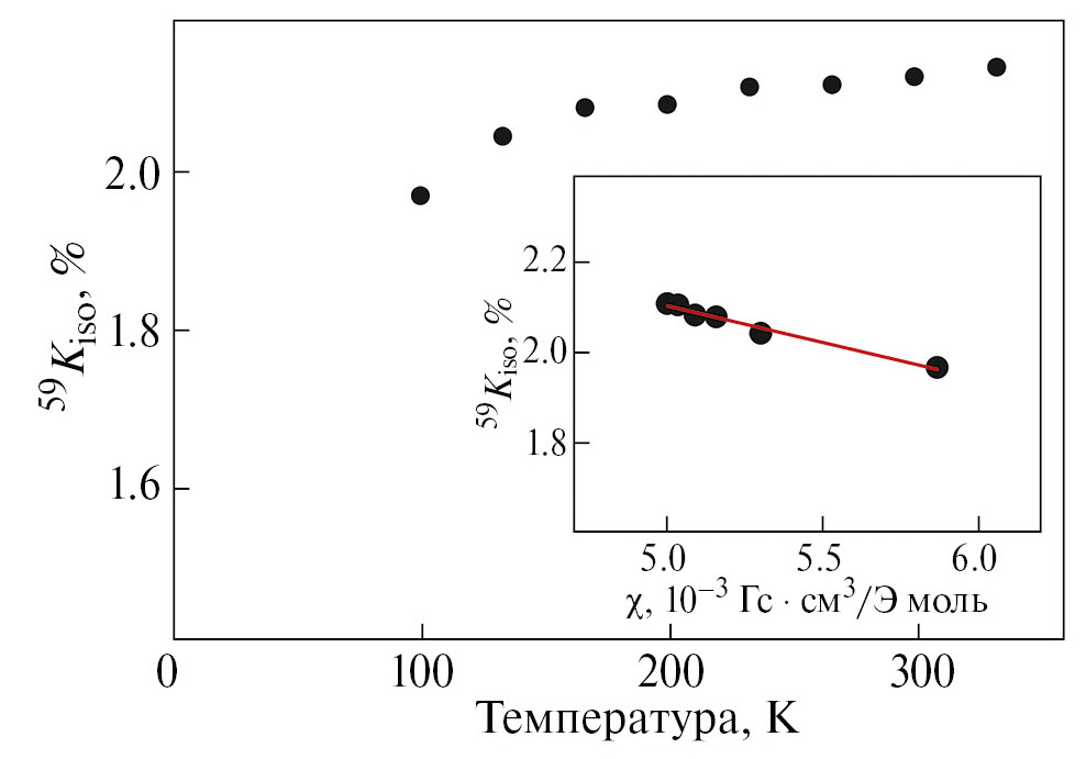 При анализе спектров ЯМР в поликристаллических образцах часто удобно перейти от компонент Kα к изотропной Kiso = ⅓ · (Kx+Ky+Kz), аксиальной Kax = ⅓ · (Kz – ½(Kx + Ky)) и анизотропной Kaniso = ½(Ky – Kx) частям тензора магнитного сдвига линии ЯМР. Моделирование спектров в программе “Simul” показало, что значения Kax, Kaniso и η в области температур выше TC = 196 K близки к нулю, νQ = 2.2(1) МГц не изменяется с температурой. Что касается Kiso, его температурная эволюция представлена на рис. 5. При T > TC она имеет вид прямой y = a – b/(T – c), где a, b, c – константы, т. е. содержит Кюри–Вейсовский вклад.