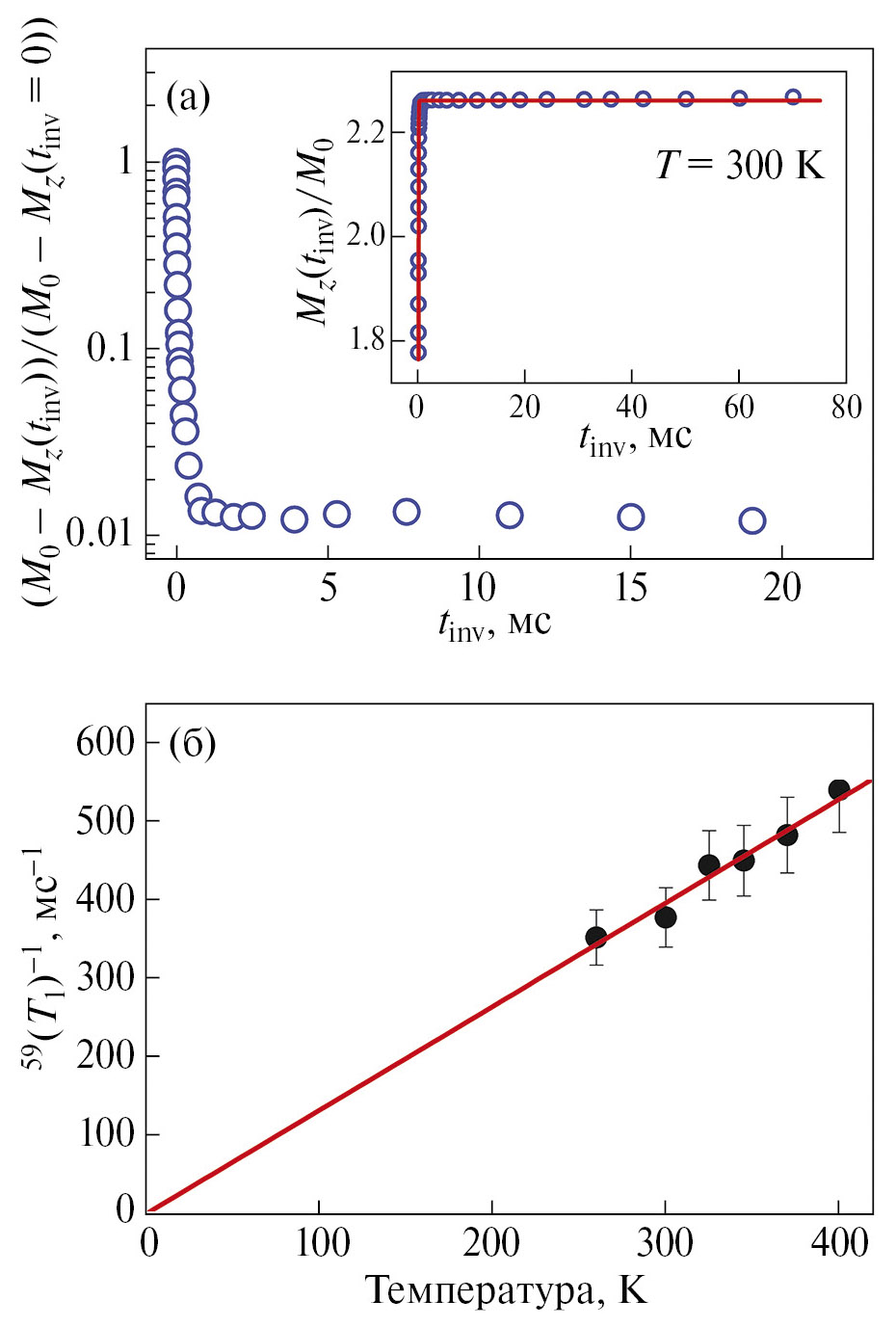 Рис. 6. Зависимость величин (M₀ – Mz(tᵢₙᵥ))/(M₀ – Mz(tᵢₙᵥ = 0)) и Mz(tᵢₙᵥ)/M₀ (на вставке) от tᵢₙᵥ в соединении Fe₄Co₃Se₈ при Т = 300 К, сплошные линии – результат аппроксимации данных выражением (а). Температурная зависимость скорости ядерной спин-решеточной релаксации Т₁⁻¹. Прямая линия – аппроксимация данных прямой линией (б).