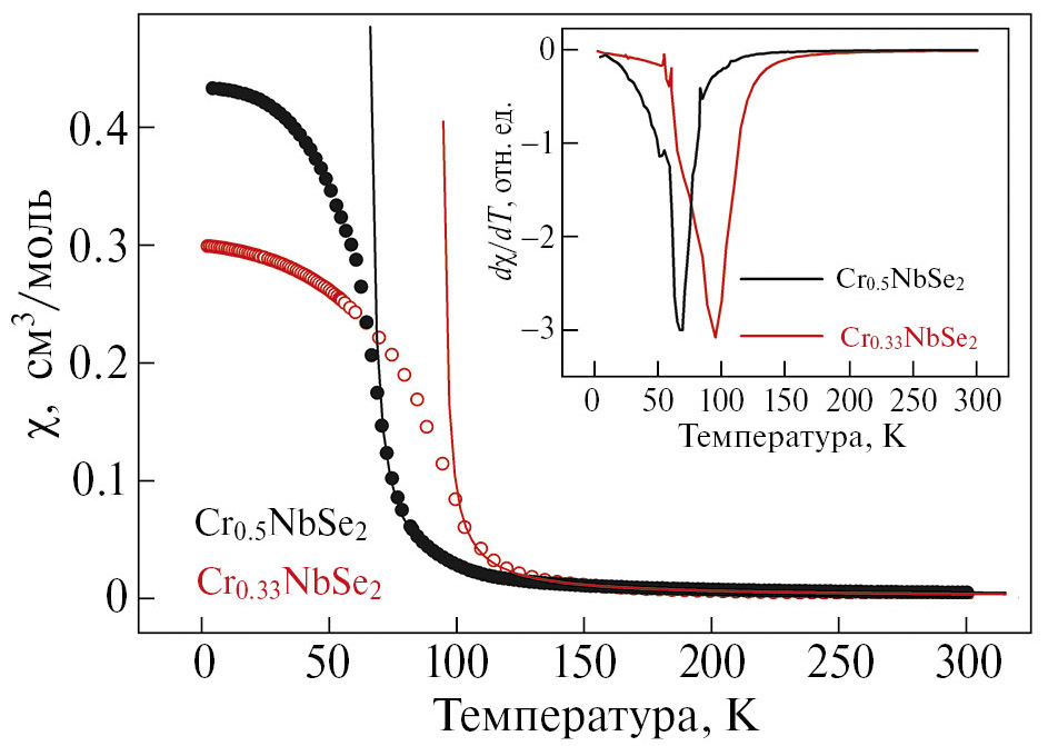 Температурные зависимости магнитной восприимчивости χ(T) халькогенидов Cr0.33NbSe2 и Cr0.5NbSe2 представлены на рис. 1. Т‑зависимости производной dχ/dT (вставка рисунка) позволяют более точно определить температуры Кюри TC = 95 K и TC = 67 K для этих составов.