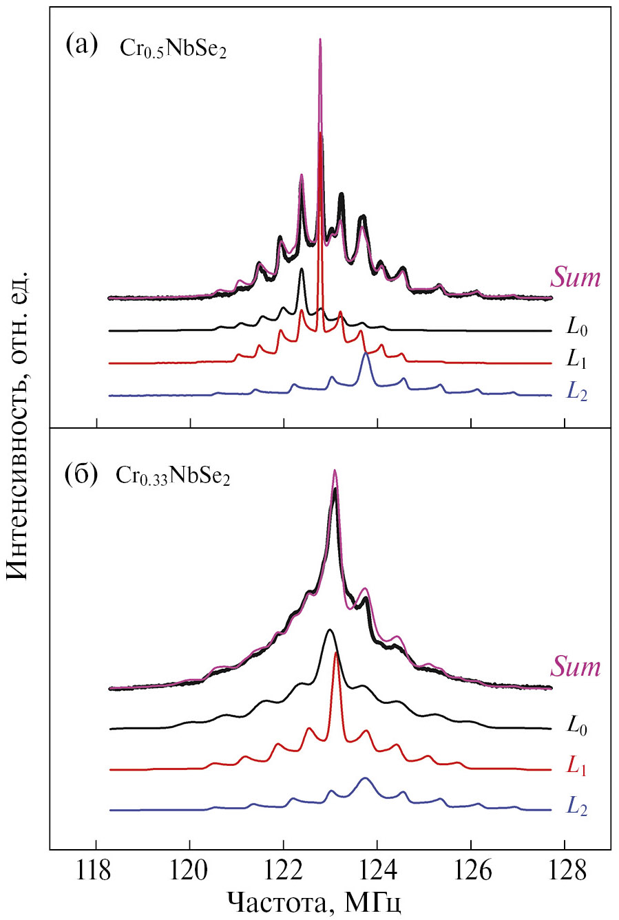 Рис. 2. Спектры ЯМР ядер ⁹³Nb в поликристаллических образцах CrₓNbSe₂ (x = 0.33, 0.5) в магнитном поле Н₀ = 117.47 кЭ при температуре T = 295 K и результат моделирования экспериментальных спектров набором из трех подспектров (L₀, L₁, L₂) с различными значениями компонент тензора магнитного сдвига и тензора ГЭП (представлены в табл. 1). Спектр Sum является суммой подспектров L₀, L₁, L₂.