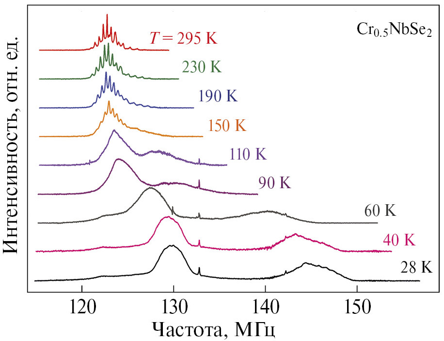 На рис. 4 показана эволюция спектров ЯМР 93Nb в составе Cr0.5NbSe2. При низких температурах в магнитоупорядоченном состоянии Cr0.5NbSe2 четко видны три линии с разными сдвигами, подтверждающие наличие как минимум трех позиций атомов Nb с разным числом атомов хрома в ближайшем окружении. Анализировать их относительные интенсивности при низких температурах затруднительно, поскольку ниже TС каждая из этих линий характеризуется собственным так называемым коэффициентом усиления сигнала в ферромагнетиках [13]. Кроме того, изменение спектров 93Nb с температурой, их относительно небольшие сдвиги в сторону более высоких частот, уширение непосредственно свидетельствуют о малости локальных магнитных полей на ядрах Nb в магнитоупорядоченном состоянии исследуемых халькогенидов.