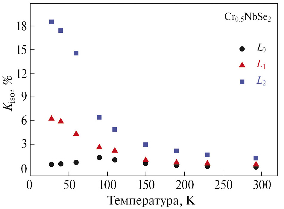 Рис. 5. Температурные зависимости магнитного сдвига Kiso линий ЯМР L₀, L₁ и L₂ в Cr₀.₅NbSe₂.
