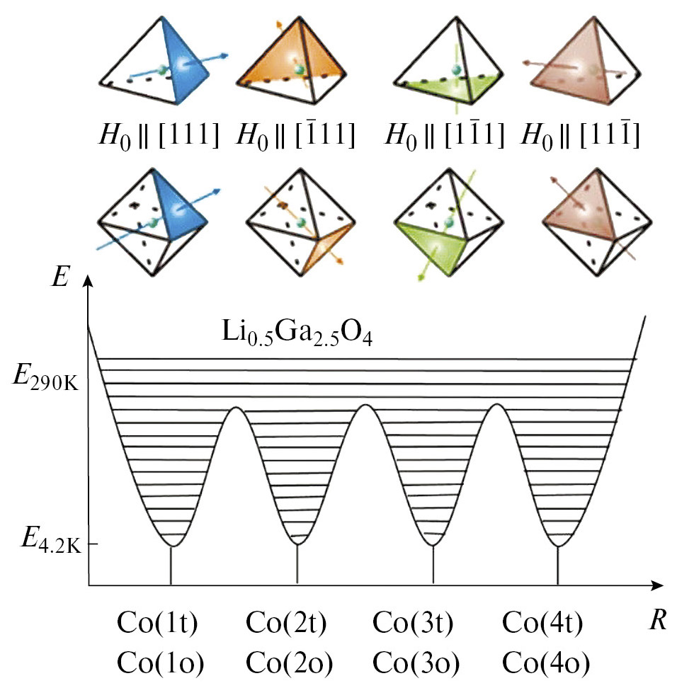 Вдоль кристаллографических направлений типа [111] форма многоминимумного потенциала имеет эквивалентные минимумы, разделенные потенциальными барьерами. На рис. 4 стрелками показаны направления <111>. Эти направления перпендикулярны плоскостям (111) октаэдров и тетраэдров. Приведены четыре минимума. Магнитное поле Н0 параллельно главной магнитной оси z ионa Co²⁺, направление показано стрелкой. В элементарной ячейке имеются магнитно неэквивалентные положения ионов Co²⁺, расположенные в тетраэдрическом и октаэдрическом кислородном окружении. Показаны такие комплексы в виде октаэдров и тетраэдров. Положения ионов Co²⁺ обозначены буквами о и t. Показаны тетраэдрические – Co(1t), Co(2t), Co(3t), Co(4t) и октаэдрические – Co(1o), Co(2o), Co(3o), Co(4o) неэквивалентные положения ионов кобальта.