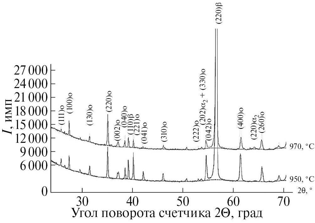 Анализ данных на рис. 8 показал, что после охлаждения в ячейке СТА со скоростями 10…80 °С/мин с температур нагрева 950, 970 °C на дифрактограммах присутствуют только линии О-, β-фаз. Линии α2-фазы, наблюдавшиеся после закалки с 970 °С, отсутствуют, но при этом возникают, например, слабые дополнительные линии на углах ≈62°…63° и ≈64°…65° типа 400о и 260о, характерные для О-фазы, имеющей низкую ромбичность из-за относительно малого содержания в ней ниобия [37, 38] (показано на рис. 8б пунктиром изменение положения этих линий в зависимости от скорости охлаждения). Из этого можно заключить, что в ходе замедленного охлаждения происходит трансформация неравновесной при низких температурах α2-фазы в О-фазу, что наблюдали и ранее [39].