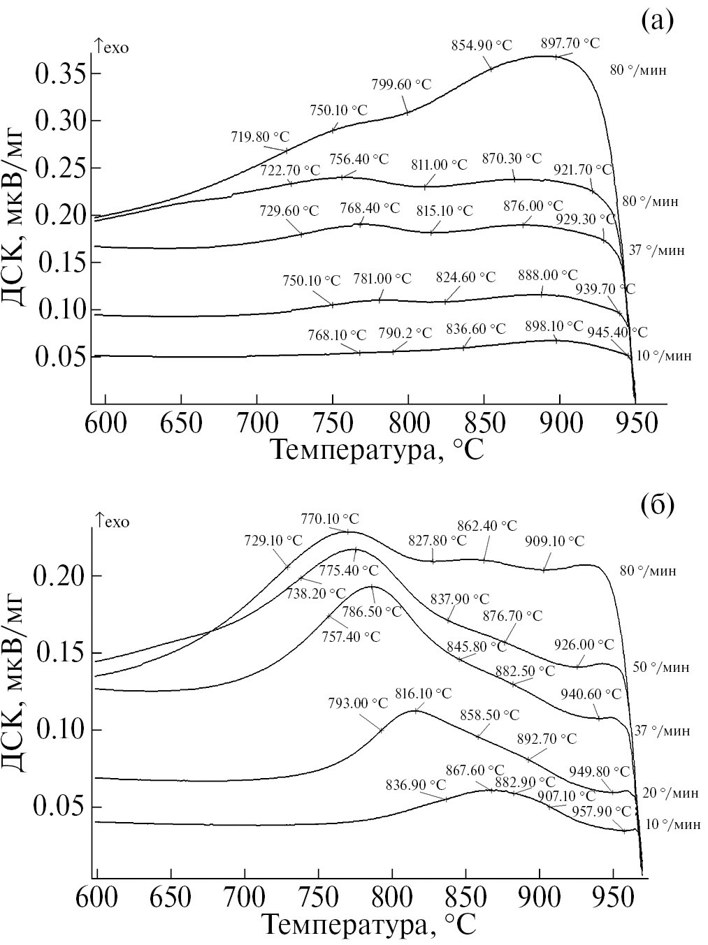 Рис. 4. Термограммы, снятые в процессе охлаждения сплава ВТИ-4 со скоростями 10, 20, 37, 50, 80°С/мин с температур нагрева: а – 950°С, б – 970°С (скорость охлаждения увеличивается на рисунках от нижней к верхней кривой).