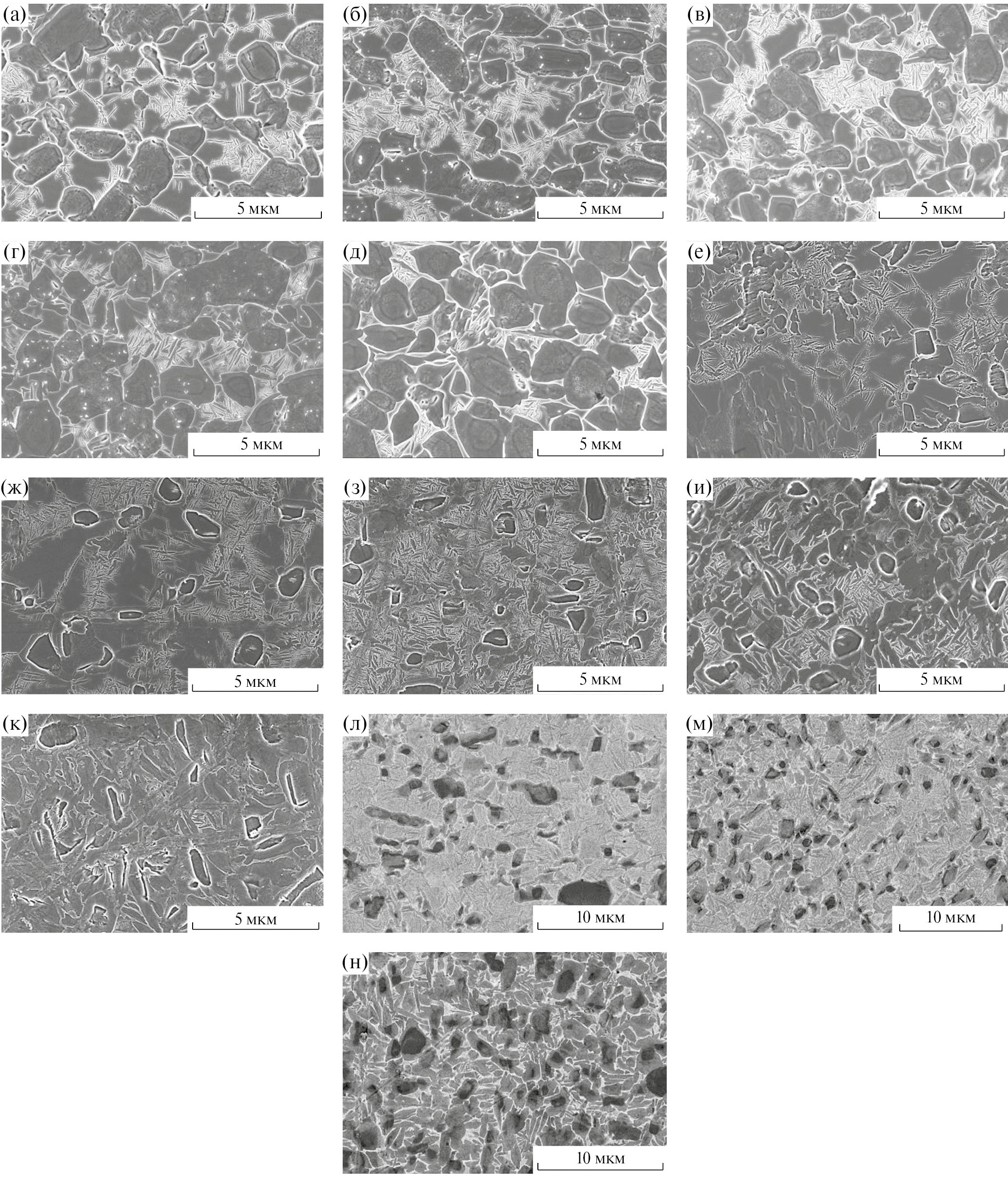 Рис. 5. Микроструктура сплава ВТИ-4 после охлаждения с различными скоростями (v) с температур нагрева (Т): а – д – T = 950°С, е–н –T = 970°С; а, е – v = 80°/мин; б, ж – v = 50°/мин; в, з, л – v = 37°/мин; г, и, м – v = 20°/мин; д, к, н – ν = 10°/мин; а–к – РЭМ, съемка во вторичных электронах, л–н – РЭМ, съемка в упруго-отраженных электронах.