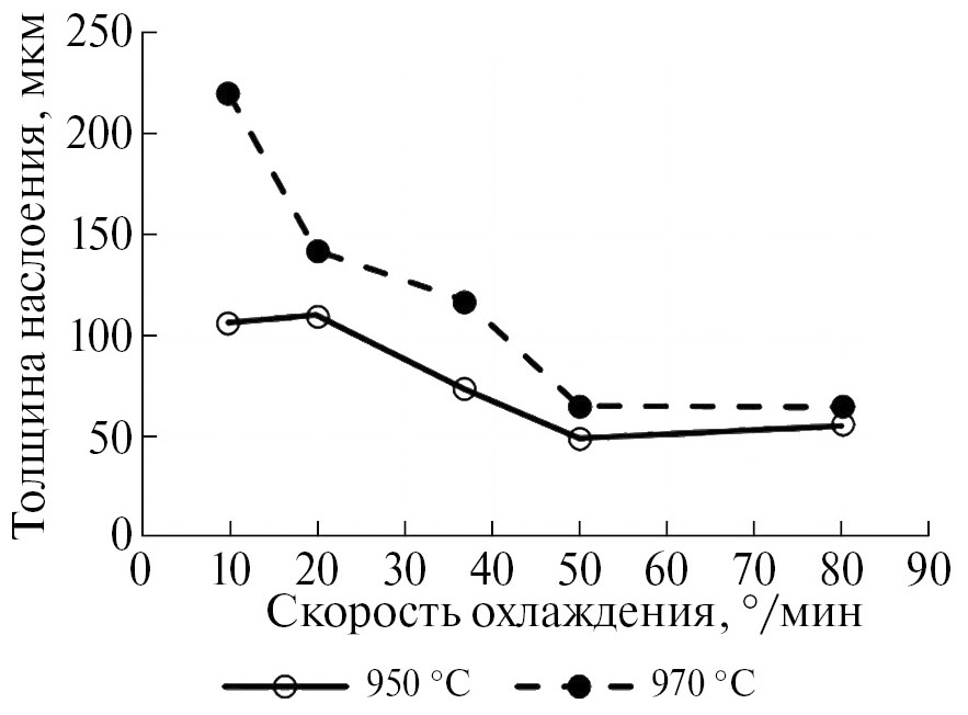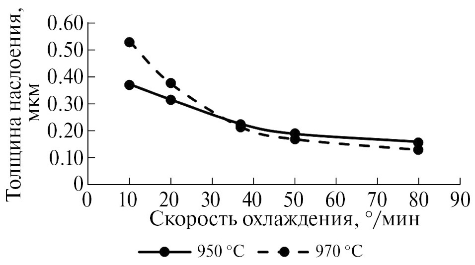Размер и объемная доля вторичных О-пластин определяется скоростью охлаждения. Наиболее крупные пластины зафиксированы в случае охлаждения с минимальной скоростью 10°/мин при температуре нагрева 970 °C. С ростом скорости охлаждения средняя толщина пластин уменьшается с 220 до 50 нм (рис. 7).