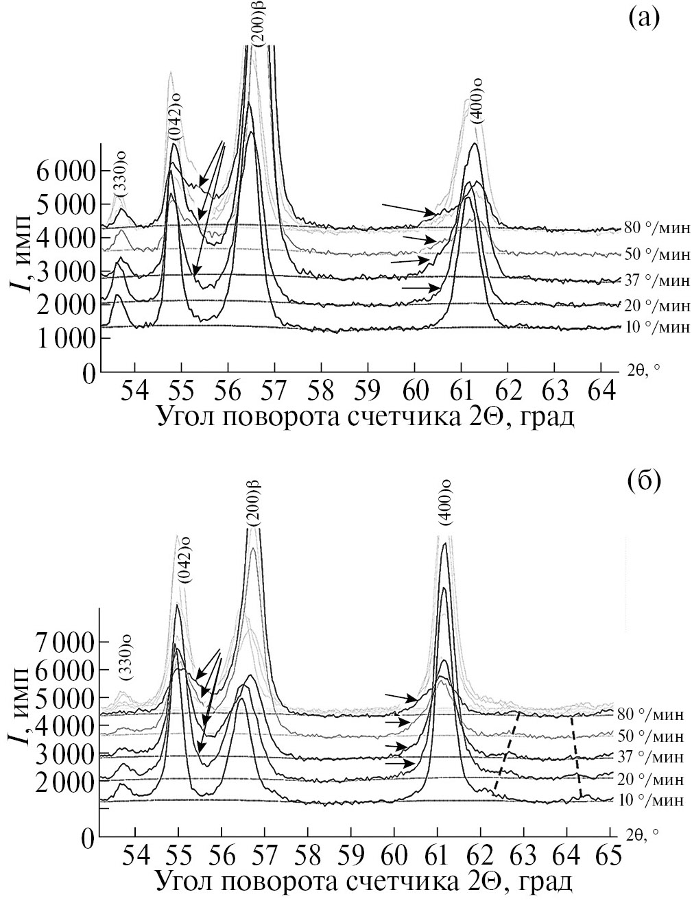 Рис. 8. Участки дифрактограмм сплава ВТИ-4, снятые после его охлаждения с разными скоростями в приборе СТА с температур 950 °С (а), 970 °С (б).
