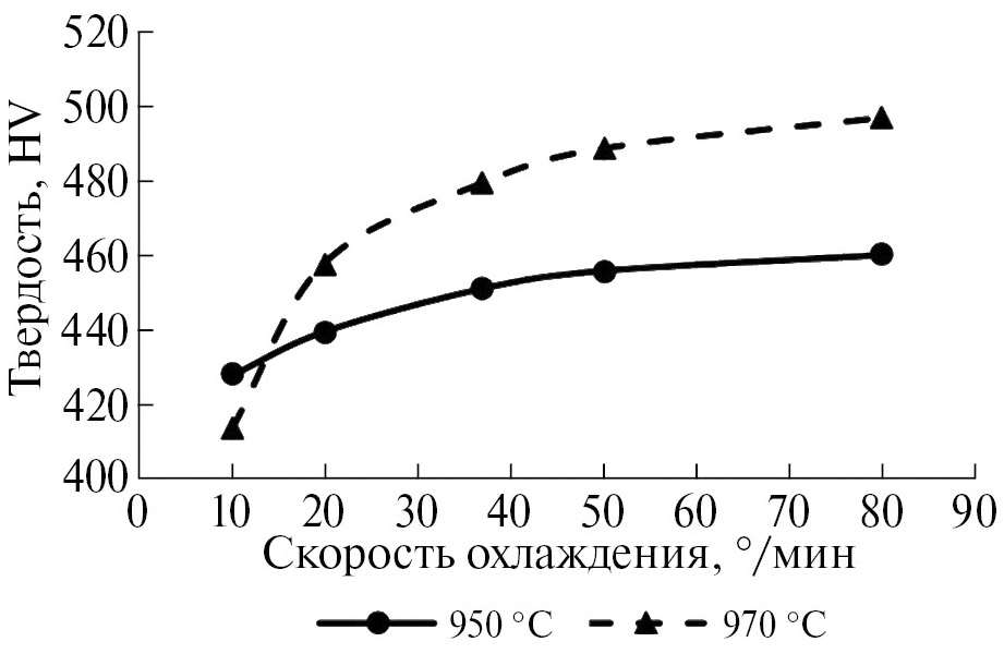 Сопоставление твердости (рис. 10а) с данными фазового состава и структуры (рис. 5, 8) позволило оценить вклад разных структурных составляющих в изменение твердости. С уменьшением скорости охлаждения при термоанализе увеличивается доля первичных (с учетом наслоения) выделений и уменьшается доля ОСВ, которые совместно, исходя из их относительно крупных размеров, мало влияют на изменение величины твердости. Наиболее значимое влияние на твердость оказывает третья структурная составляющая – β-превращенная структура с ОIIп. Дисперсность ОIIп частиц преимущественно увеличивается по мере повышения скорости охлаждения (рис. 7), что коррелирует с ростом твердости. Наиболее крупные вторичные ОIIп выделения наблюдали после охлаждения со скоростью 10°/мин с 970 °С (рис. 5, 7), что и определило минимальную твердость после этой обработки сплава (рис. 10). При более высоких скоростях охлаждения объемная доля β-превращенной структуры в случае охлаждения с 970 °C выше, чем с температуры нагрева 950 °С (рис. 5), при сопоставимой дисперсности (рис. 7), что обуславливает более высокие значения твердости при одинаковой скорости охлаждения с 970 °С.