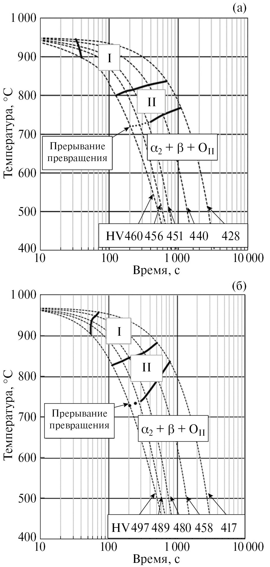 Рис. 12. Диаграммы распада высокотемпературной β (В2)-фазы в сплаве ВТИ-4 при охлаждении с температур нагрева 950 °С (а) и 970 °С(б). Область I – распад протекает за счет движения межфазной Оп /β-границы, область II – распад протекает с образованием пластин вторичной О-фазы.