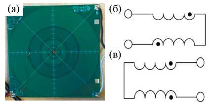 Рис. 1. Фотография плоской катушки (а); схемы включения намагничивающих и детектирующих катушек соответственно (б, в).