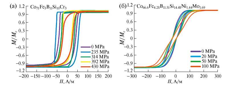 Рис. 3. Петли магнитного гистерезиса микропроводов составов Co71Fe5B11Si10Cr3 (образец № 1 – a) и Co66.6Fe4.28B11.51Si14.48Ni1.44Mo1.69 (образец № 2 – б) для различных внешних напряжений.