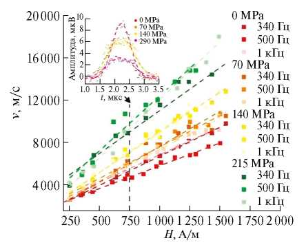 Рис. 4. Скорость распространения ДГ вдоль оси микропровода состава Co71Fe5B11Si10Cr3 (образец № 1) как функция магнитного поля для различных значений приложенных напряжений. Данные приведены для нескольких частот магнитного поля (340, 500, 1000 Гц). Вставка показывает форму индуцированного сигнала в одной из детектирующих катушек при поле 750 A/м и частоте 500 Гц.