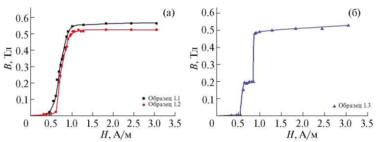 Рис. 3. Начальные участки кривых намагничивания образцов 1.1, 1.2 (а) и 1.3 (б).