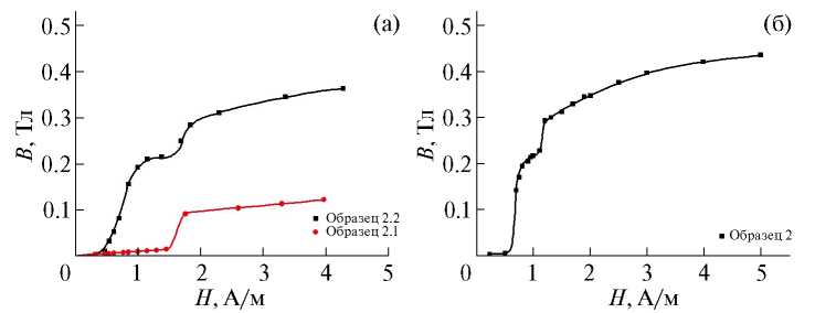 Анализ начального участка кривой намагничивания образца 2.2 (рис. 5а) с бимодальной полевой зависимостью магнитной проницаемости (рис. 1б) показывает, что и в этом случае имеет место ступенчатый вид кривой, но с плавным перегибом в той же области магнитной индукции, что и для образца 1.3. На рис. 5б и 6б представлены начальные участки кривых намагничивания образцов 2 и 2.4 с бимодальной полевой зависимостью магнитной проницаемости, вырезанных с того же края ленты, что и образец 2.2. Полевая зависимость магнитной проницаемости и петли гистерезиса для образца 2 представлены в работе [2]. Образец под номером 2 относится к другой серии образцов, и соответствует другому участку длины ленты производства НИИМЕТ с бимодальной полевой зависимостью магнитной проницаемости.