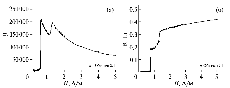 Видно, что вид начальных участков кривых намагничивания аналогичен. Некоторое отличие имеет начальный участок образца 2.4. Небольшой горизонтальный участок при индукции около 0.2 Тл, соответствующий резкому возрастанию магнитной проницаемости в области первого максимума, переходит в плавную линию. Далее имеет место более резкое возрастание магнитной индукции вплоть до достижения поля второго максимума на полевой зависимости магнитной проницаемости (рис. 6а). Следовательно, в образцах этой части ленты не наблюдается процессов намагничивания при последовательном участии слоев. Намагничивание начинается с вовлечения в процесс первого слоя, затем при увеличении поля вовлекается второй слой. Процесс смещения доменных границ заканчивается вкладом обоих слоев без разделения их участия в процессе намагничивания. Тем не менее замечателен тот факт, что вклад первого слоя в процессы намагничивания и в этом случае заканчивается при достижении магнитной индукции значения около 0.2 Тл, как и для образца 1.3 ленты производства МСТАТОР.