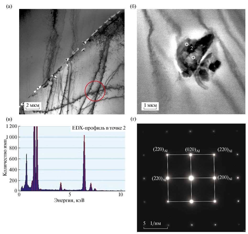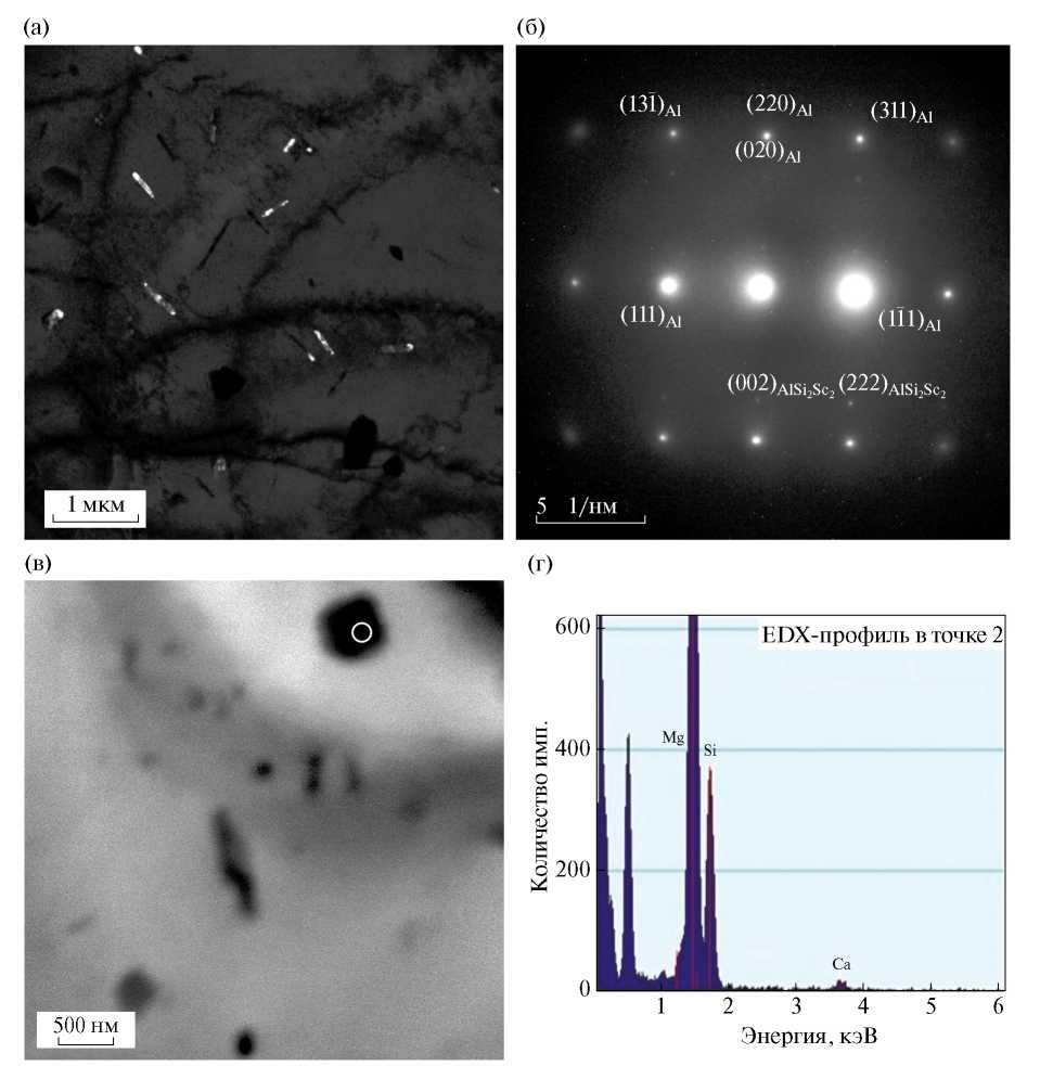 Данные просвечивающей микроскопии показывают, что в исходном литом состоянии структура сплава AlMgSiScZr в объеме зерен является однофазной (рис. 3а). Однако по границам кристаллитов алюминиевого твердого раствора выявляются крупные интерметаллидные частицы кристаллизационного происхождения размером до нескольких микрон (рис. 3б). Энергодисперсионный анализ химического состава включений позволил установить, что в большинстве своем они представляют собой фазы на основе Si. Также было обнаружено, что некоторые из них обогащены атомами Zr и Sc (рис. 3в). Эти данные хорошо коррелируются с теми, что были получены с использованием СЭМ. На микроэлектронограммах, полученных в объеме зерен, рефлексов, соответствующих выделениям вторых фаз, обнаружено не было (рис. 3г). На электронно-микроскопических изображениях структуры сплава визуализируются только единичные дислокации и дислокационные сетки.