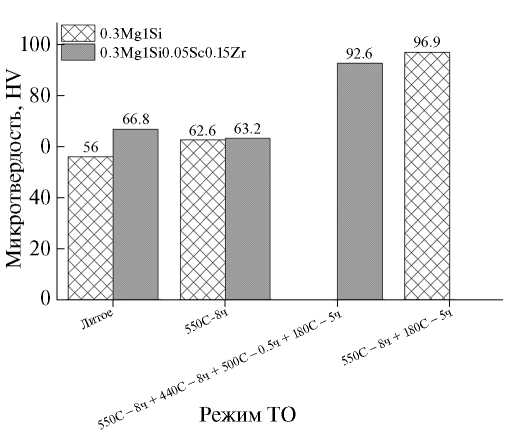 Рис. 10. Микротвердость сплавов AlMgSi и AlMgSiScZr в литом состоянии и после термической обработки.