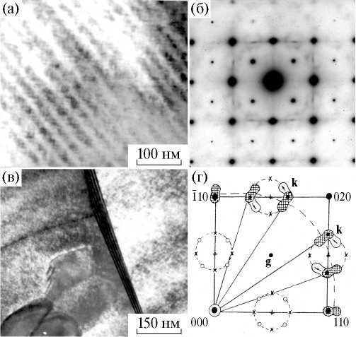 На рис. 1а и 2а представлены типичные изображения твидового контраста микроструктуры сплава Ti49Ni51 в предпереходном B2-состоянии и на рис. 1в, г и рис. 2б – микроэлектронограммы в рациональных сечениях (100)*B2 и (111)*B2 (соответственно осях зон отражающих плоскостей (о. з.) [100]B2, [111]B2), на которых видны диффузные тяжи <110>* и сателлиты типа 1/3<110>*, 1/2<110>*. Природа наблюдаемого твидового контраста и диффузного рассеяния подробно описана в [13, 14, 27–32].