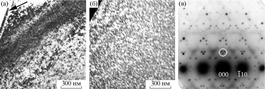 Рис. 4. Светло- (а) и темнопольное (б) – в трех рефлексах, обозначенных кольцом на микроэлектронограмме 4в, ПЭМ-изображения микроструктуры и соответствующая микроэлектронограмма (в, о. з. [115]B2) сплава Ti49Ni51 после ПИО при 623 К в течение 1 ч.