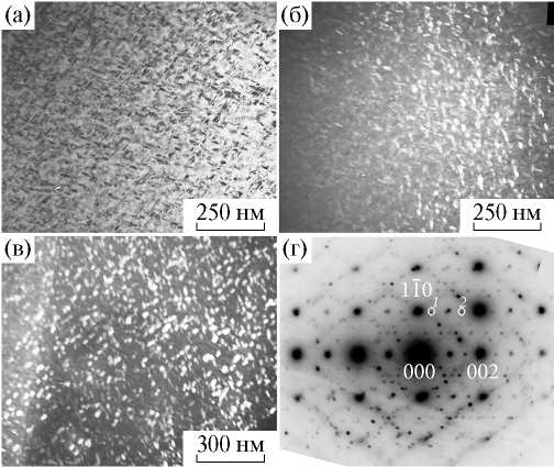 Рис. 5. Светло- (а) и темнопольные (б, в) в рефлексах, обозначенных цифрами 1 и 2 на микроэлектронограмме 5г, ПЭМ-изображения микроструктуры и соответствующая микроэлектронограмма (г, о. з. [110]B2) сплава Ti49Ni51 после ПИО при 673 К в течение 1 ч.
