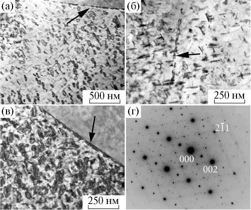 Наконец, с гомогенным внутризеренным конкурирует гетерогенный механизм распада, при котором имеет место выделение на границах зерен (см. рис. 3a, 4а, 6), субграницах и дислокациях (рис. 6б) (отмечено стрелками на рис. 3, 4, 6). Гетерогенный механизм распада, в том числе образуя зоны, свободные от выделений вблизи границ, играет негативную роль, в основном приводя к снижению пластичности стареющих сплавов.