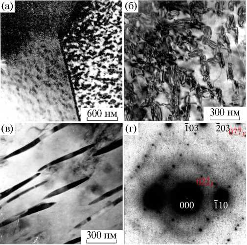 Рис. 6. Светлопольные (a–в) ПЭМ-изображения микроструктуры и соответствующая микроэлектронограмма (г, о. з. [120]B2) сплава Ti49Ni51 после ПИО при 773 К в течение 1 ч.