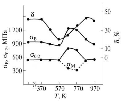 Рис. 8. Зависимости пределов прочности σB, дислокационной σ0.2 и фазовой σM текучести и относительного удлинения δ от температуры старения закаленного сплава Ti49Ni51.